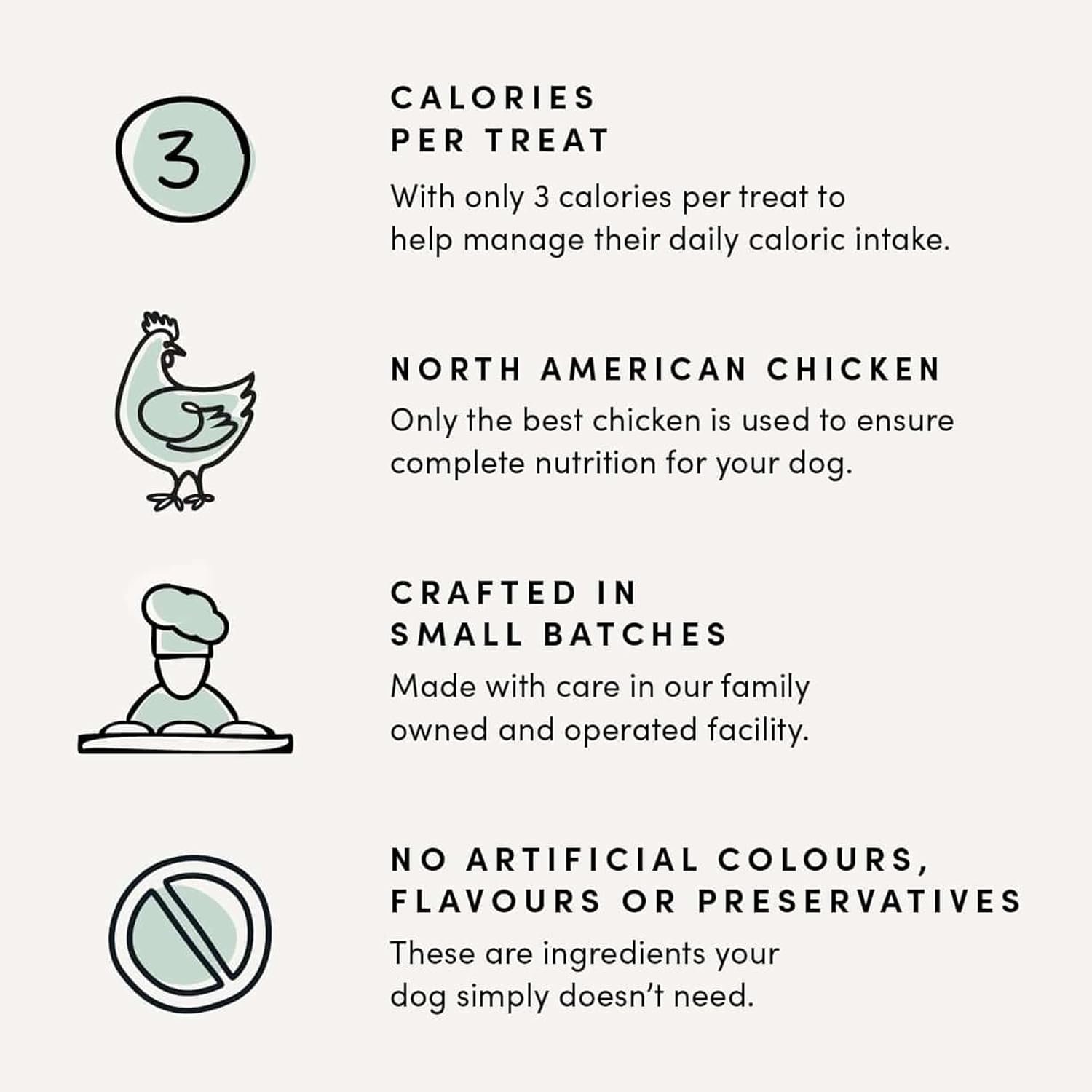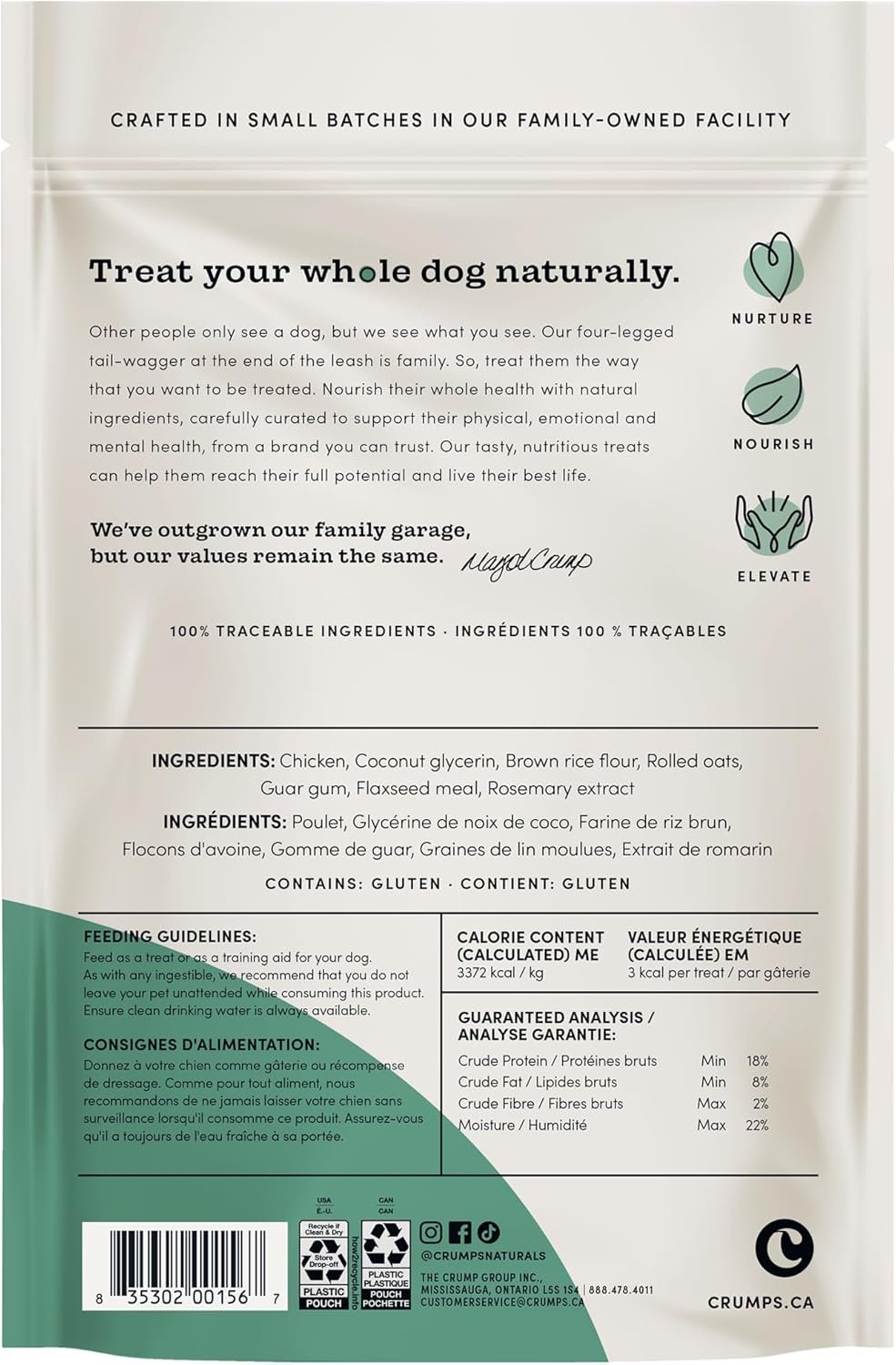 There is nothing mini about these Mini-Trainers except size. Packed full of flavour, these semi-moist chicken treats are perfect for daily treating and training. Made from 100% Canadian Chicken. Each bite size morsel is low in calories and packed with yummy chicken making it a premium ideal training treat. Made in Canada with all natural, high-quality ingredients, this tasty treat is protein-rich and minimally processed. Made with care in our kitchen in small batches. Dogs naturally crave meat and will love this protein-rich all-natural treat! Every Crumps’ Naturals Treats encourages better pet health with all-natural healthy ingredients to aid in digestion, vitamin absorption, decrease allergy issues, promote vibrant skin and coat, promote healthy gums and teeth and a healthy immune system. No additives. No Preservatives. No Artificial Colours.