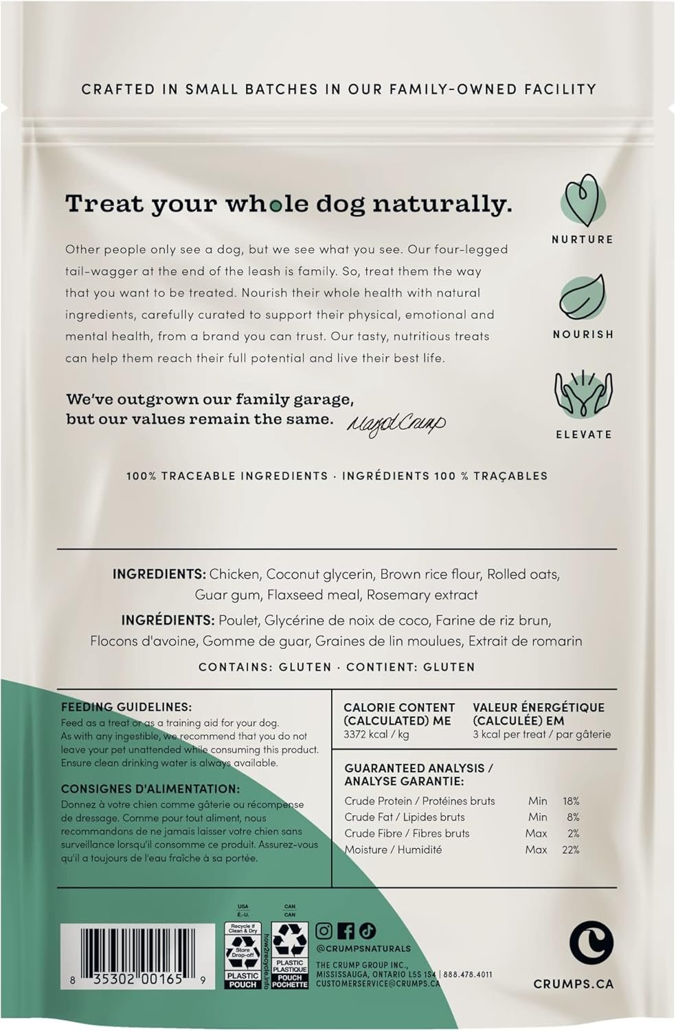 Made with premium North American chicken, these soft and chewy high protein training treats are perfect for dogs of all ages and sizes. Each delicious bite sized piece has 3 calories making it the ideal low calorie solution for repetitive rewards training. Our Mini Trainers are irresistible and all natural, crafted in small batches in our family-owned facility with no artificial colours, flavours or preservatives. Keep your pup motivated and fuel their potential with Crumps’ Naturals Semi-Moist Chicken Mini Trainers.