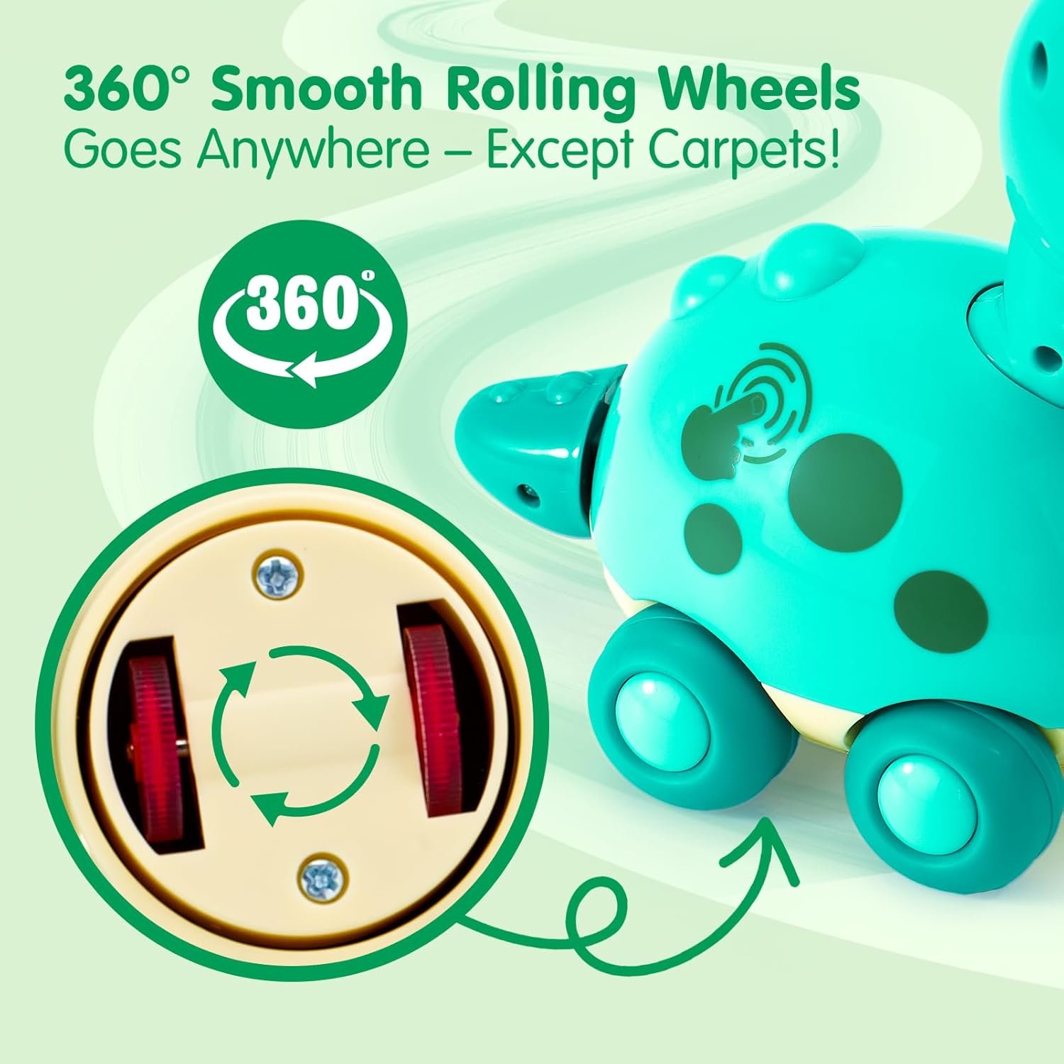 🎮【Intuitive Touch & Chase】Our toy replaces traditional buttons with sensors for an interactive chase game experience. The Bump & Go feature ensures it changes direction upon obstacles, enhancing your baby’s spatial awareness.