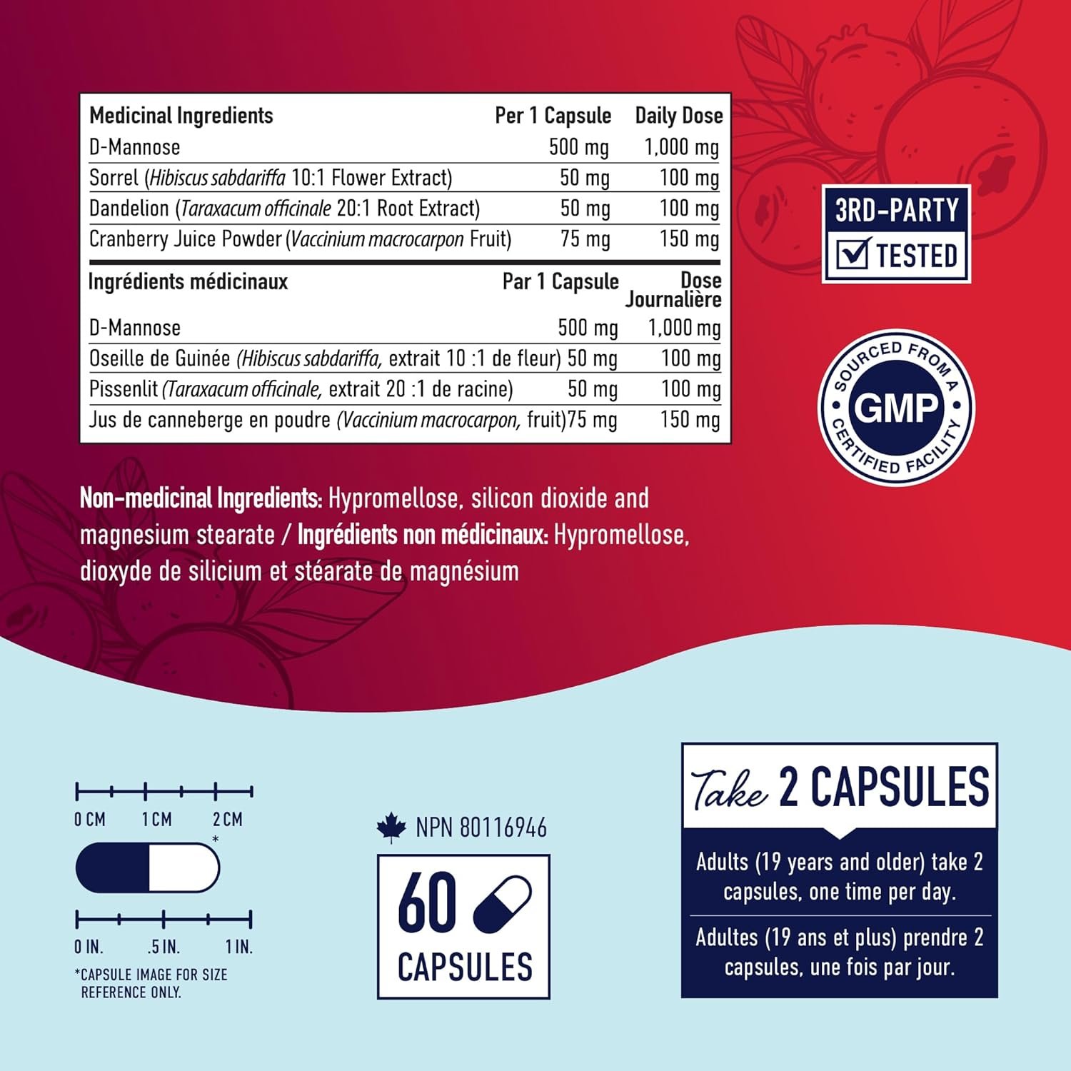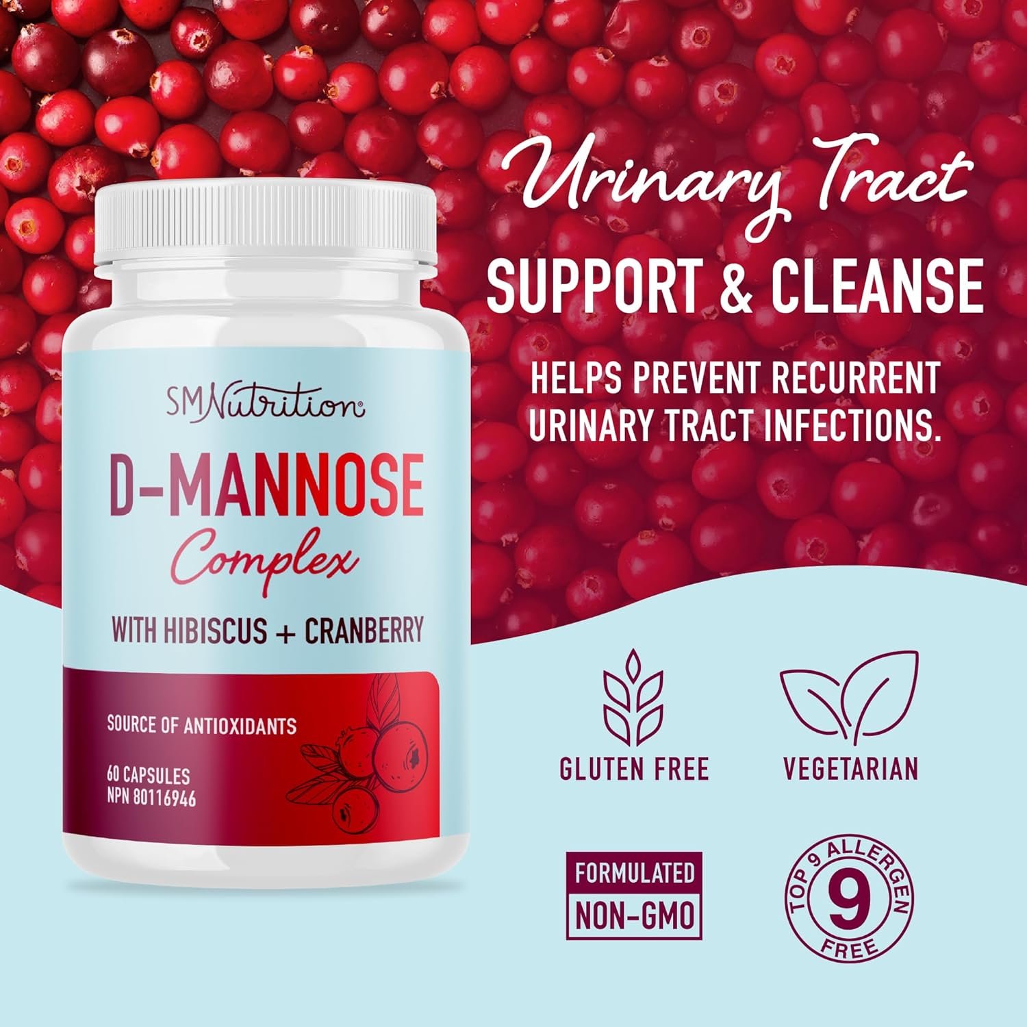 THE SMNUTRITION DIFFERENCE: D-Mannose Complex is 3rd-Party Tested, Gluten-Free, Formulated Non-GMO, Vegetarian, Health Canada Licensed, Titanium Dioxide-Free, Silicon Dioxide Free, and formulated without the top 9 allergens. It is manufactured in a cGMP, FDA registered and inspected facility.