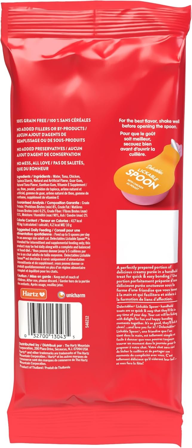 Delectables Lickable Spoon™ single-served handheld cat treats are so quick & easy that they’ll fit in any time of your day. This perfectly prepared portion of delicious creamy puree will have your cat licking with delight for fun and happy bonding moments together. It’s so good, they’ll lick it clean! …and love you for it. They’re also grain-free with no added fillers, by-products, or preservatives. Available in two irresistible flavors; Chicken and Salmon. Deliciously, De-Lick-able, Delectables!