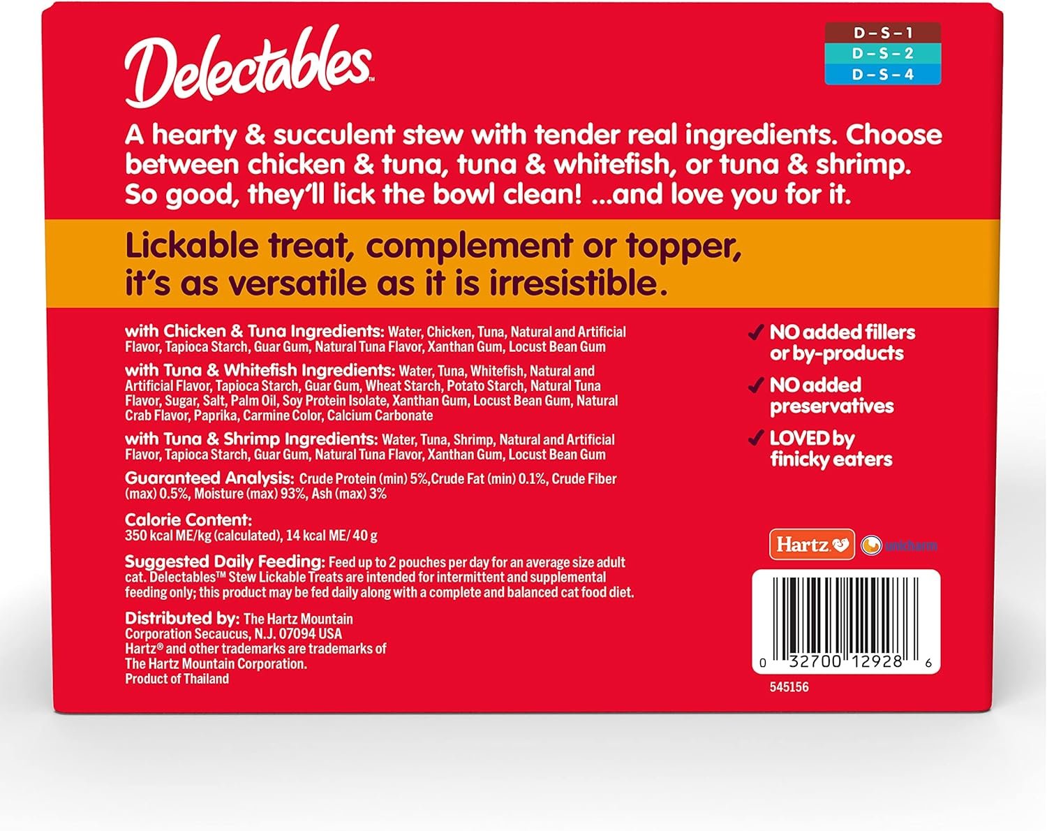 Hartz Delectables Lickable Treat are cat treats so delicious, that they’ll lick the bowl clean! With a variety of textures and flavors, these lickable cat treats are loved by both finicky eaters and cat parents alike. Delectables Stew provides a hearty and succulent texture with tender meats and sauces entangled into one delicious treat. Each pouch can be served as a lickable treat on its own, complement, or topper – it’s as versatile as it is irresistible. Delectables Stew is 100% grain-free, without any added fillers, by-products, colors, or preservatives, so there’s nothing but delight in every lick… and they’ll love you for it! Deliciously, De-Lick-able, Delectables!