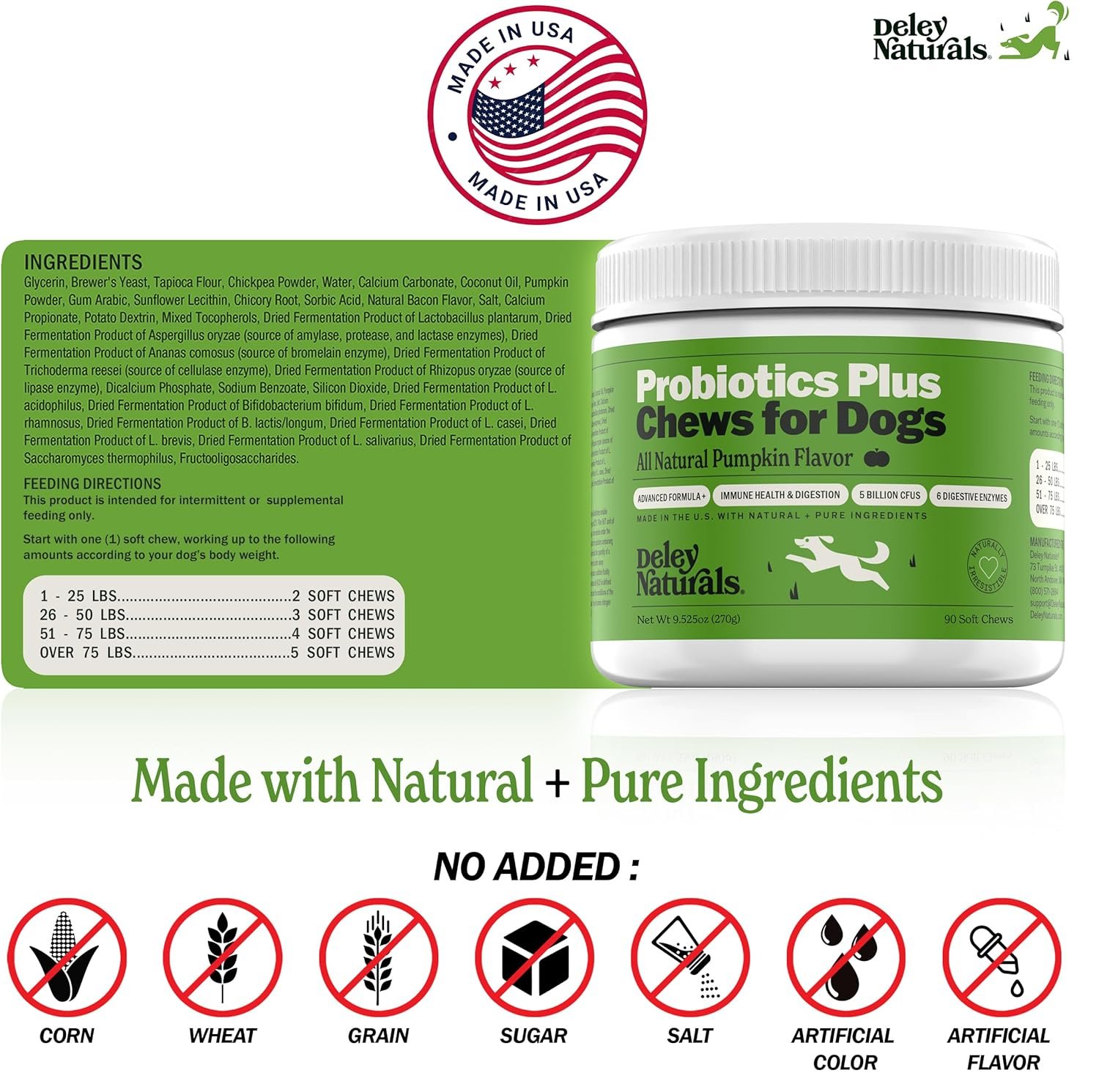 5 BILLION CFUS – Supports your dog’s immune system with dog probiotics supercharged with 5 billion CFUs and 6 powerful enzymes. Probiotics Plus is also formulated with no added corn, wheat, grain, sugar, salt, artificial colors or flavors.