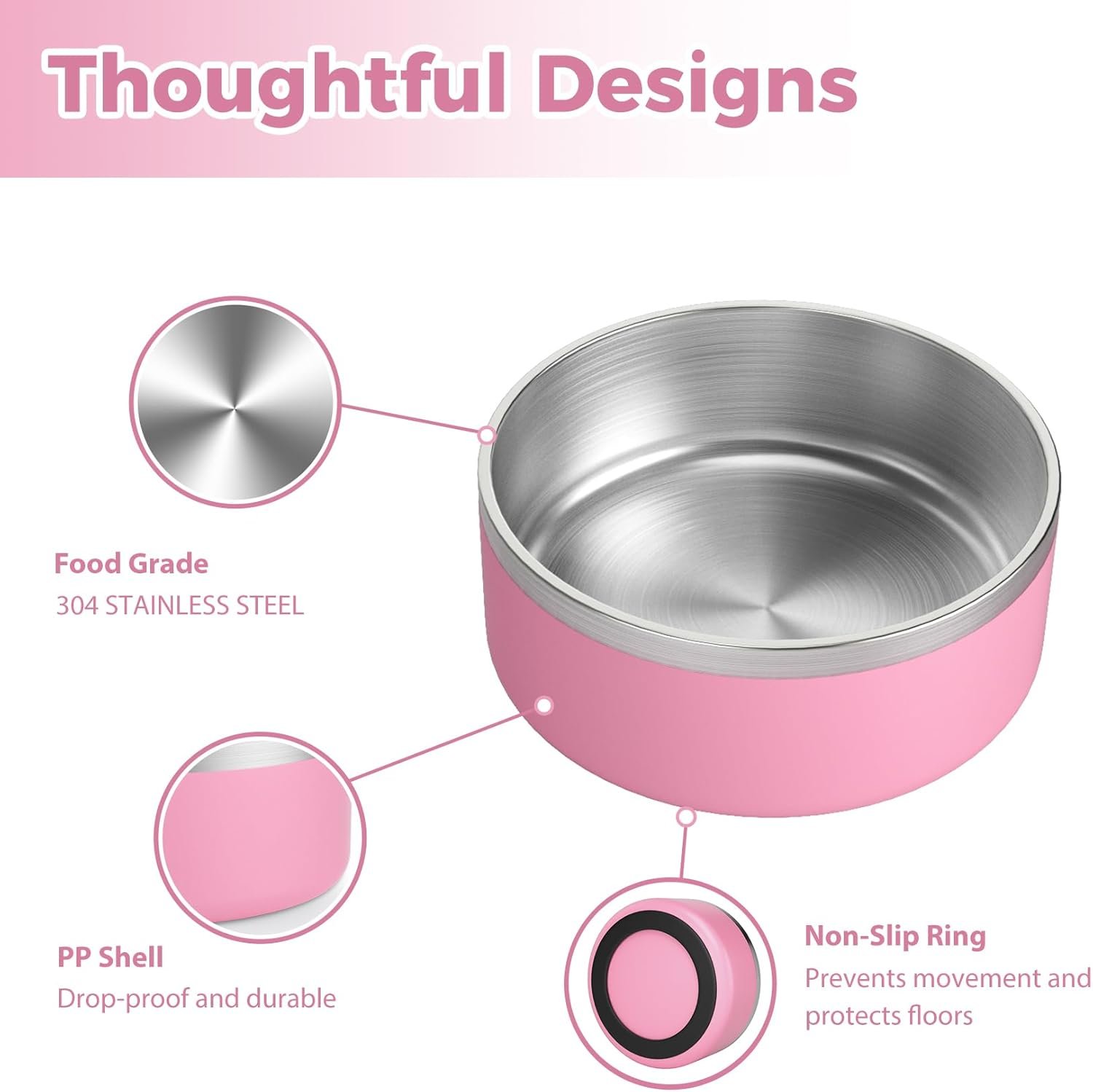 The dog bowl is made of double-layered stainless steel, which has enough weight to keep the bowl from moving; the bottom of the dog bowl is set with a non-slip ring for better anti-slip effect, and it can protect the floor from being scratched.