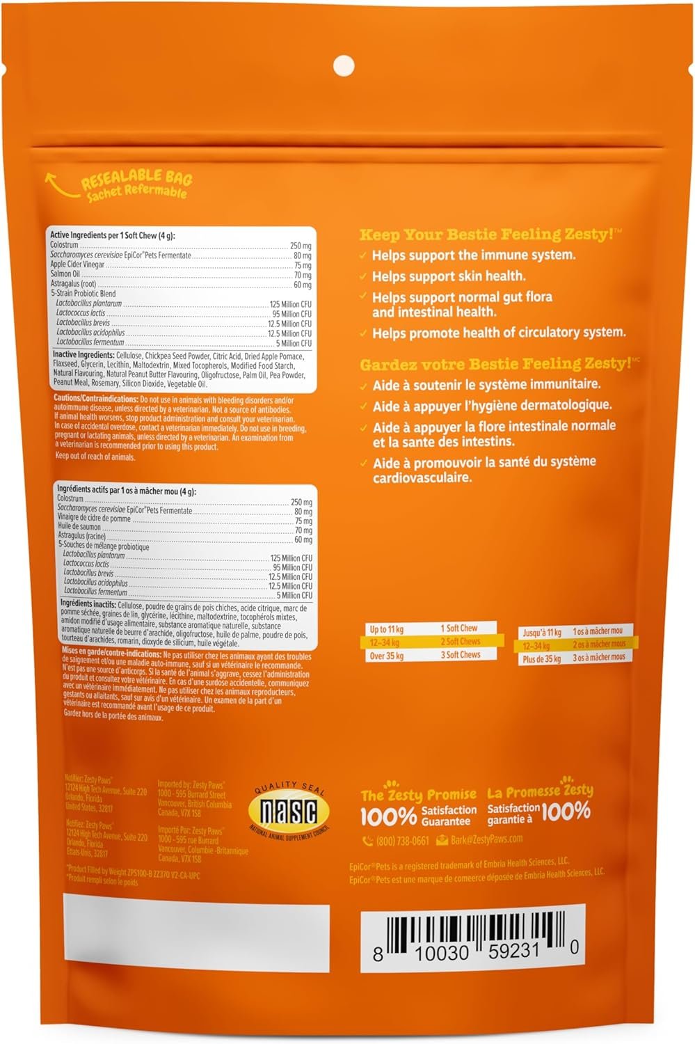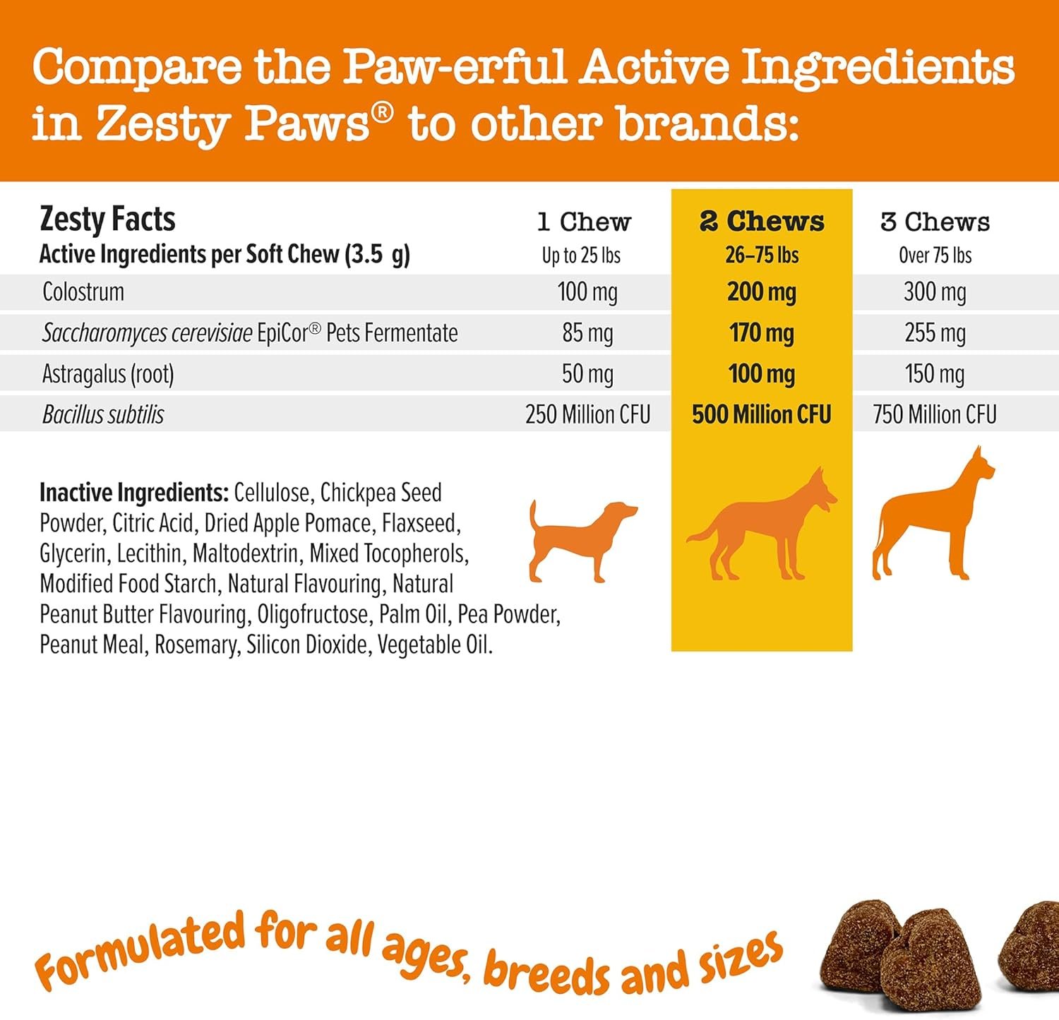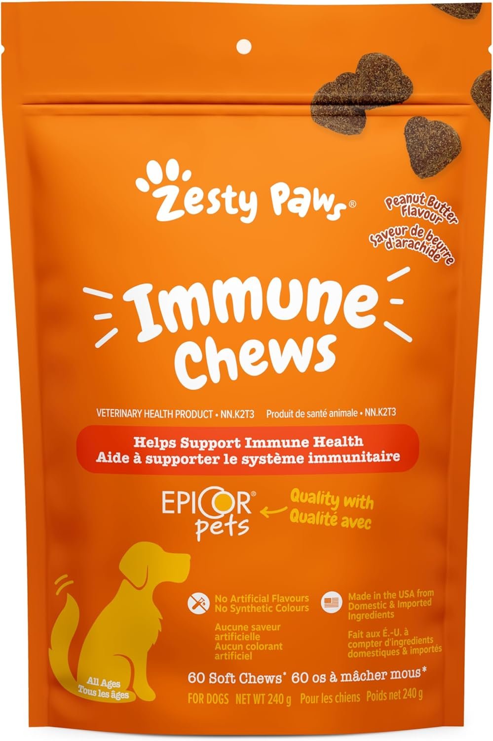 Premium Immune Support – Zesty Paws Immune Chews are supplements with EpiCor, Colostrum, Astragalus Root, and other pawsome ingredients that support the immune system for your canine pet.