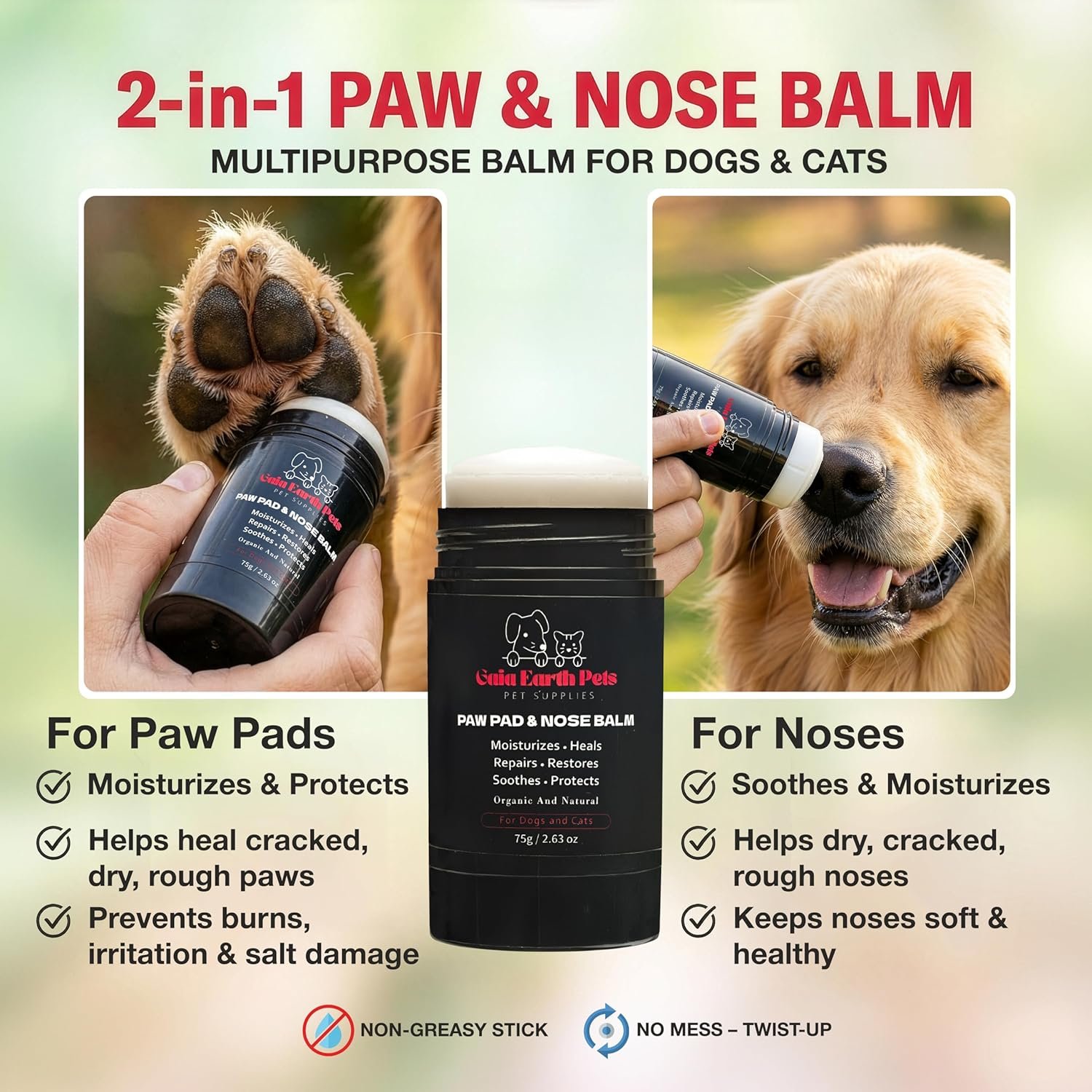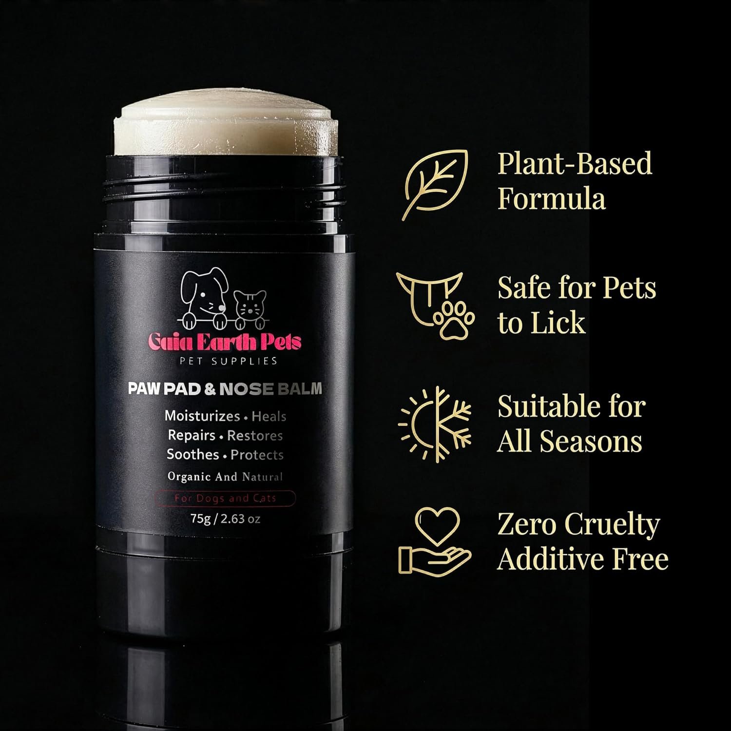Gaia Earth Pets paw balm key benefits: climate protection, natural ingredients, lick-safe formulaGaia Earth Pets paw balm key benefits: climate protection, natural ingredients, lick-safe formula