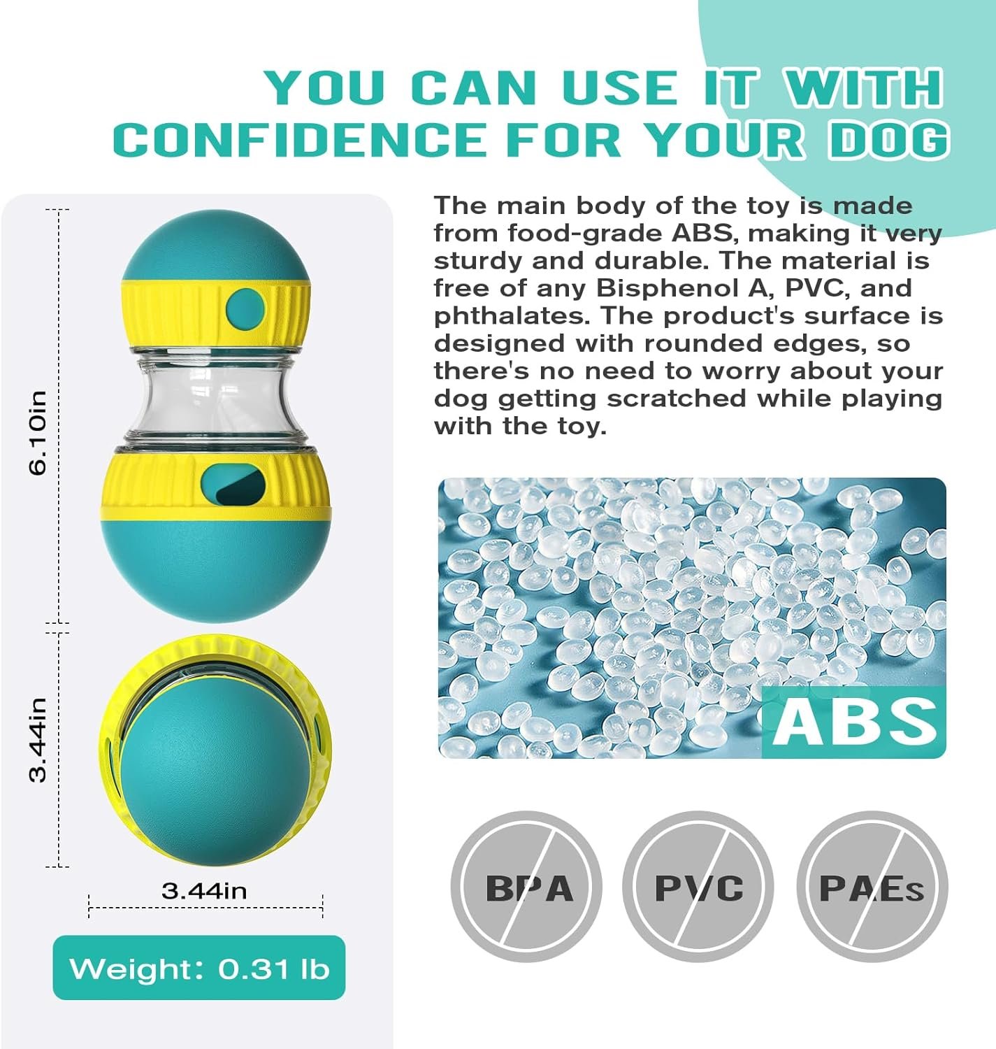 EALTHY SAFETY MATERIAL – This dog puzzle toy, pet slow feeder treat ball, is made of high-quality food-grade ABS material and does not contain any bisphenol A, PVC, or phthalates, ensuring full protection of your dog’s health. It is a tough, durable, non-toxic, and safe dog treat dispenser toy. You can confidently let your dog use it. It’s also an ideal choice for puzzle toys for dogs.