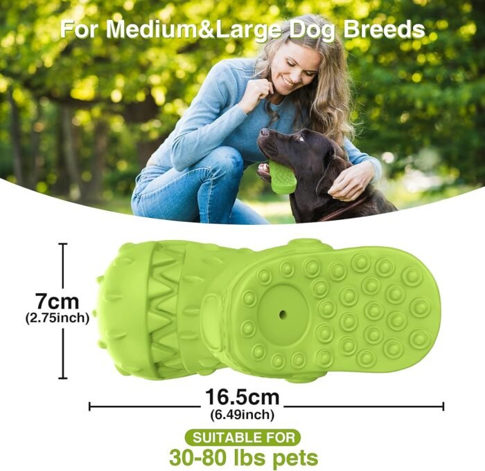 Natural rubber formula is ultra durable, specially designed for strong, heavy and aggressive chewers Strong dog toys also can be used as a dog puzzle toy, a dog food dispensing toy and an interactive toy for dogs Help dogs relieve their stress, reduce boredom and barking Make dogs more interested in thi toy, replenish while having fun and watch your dog work on their own to get treats. effectively clean teeth in all directions, fresh breath, control dental plaque and tartar, relieve teething discomfort and promote oral health