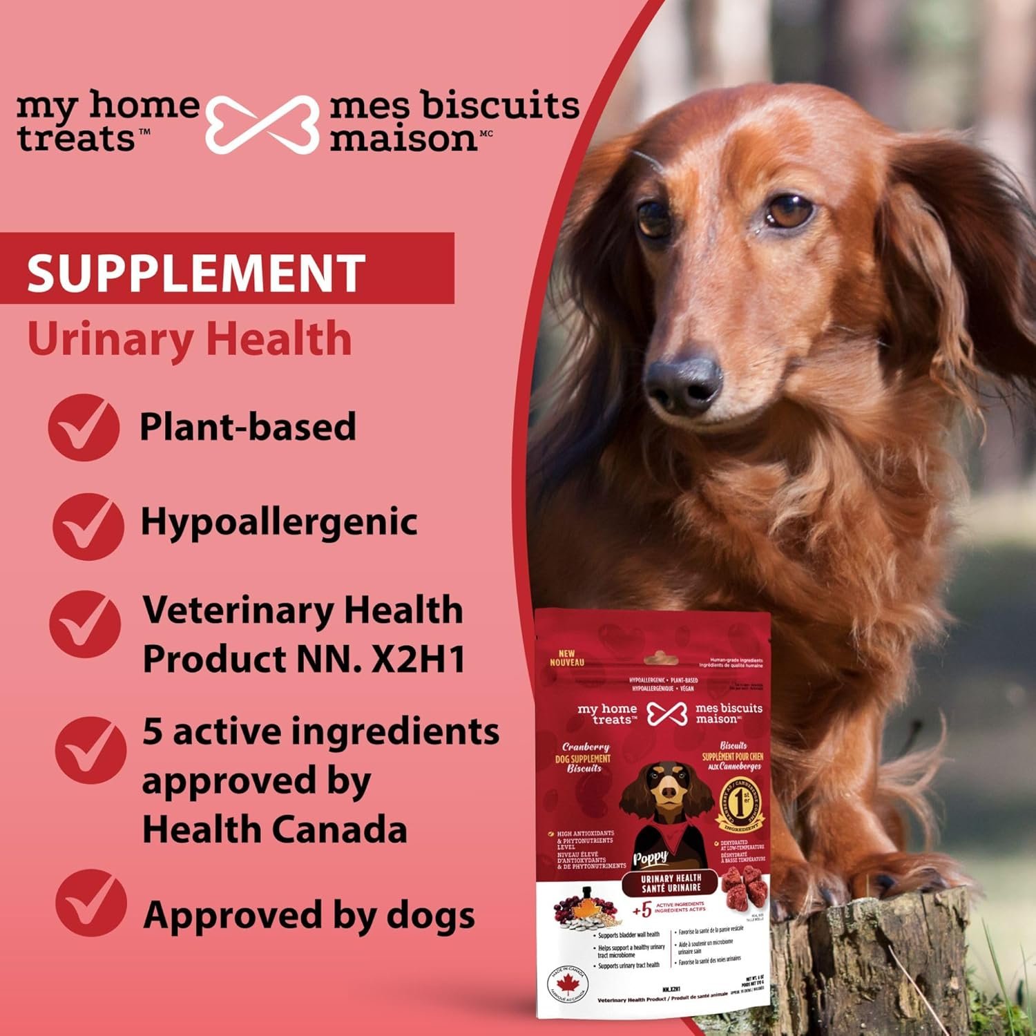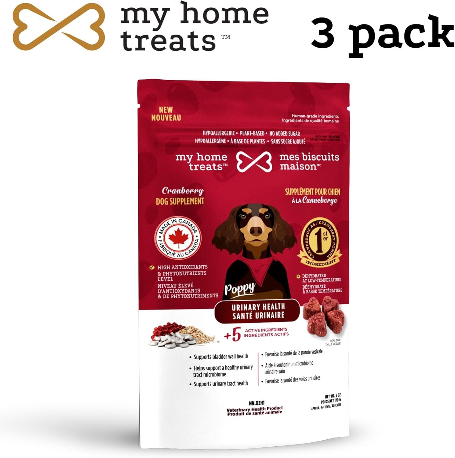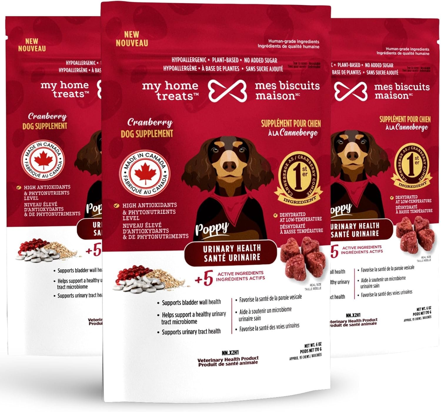 Promote urinary tract comfort and long-term bladder and kidney wellness with the Dog Urinary Health Supplement Bundle from My Home Treats. This 3-pack includes three 170 g bags of heart-shaped biscuits formulated to support urinary function, help reduce discomfort, and maintain a healthy bladder environment. Each biscuit delivers a targeted blend of cranberry, D-mannose, marshmallow root, reishi, and astragalus — ingredients known for promoting urinary tract resilience, flushing unwanted bacteria, and soothing sensitive urinary tissues. Cranberry and D-mannose help prevent bacterial adherence to bladder walls, while marshmallow root provides mucilage that supports comfort. Reishi and astragalus offer immune and kidney support. Crafted from hypoallergenic, human-grade, plant-based ingredients, these supplements are gentle enough for daily use and ideal for dogs experiencing urinary stress or needing preventive support. Approved by Health Canada (Veterinary Health Product No. NN.X2H1). Perfect for dogs prone to urinary discomfort, bladder sensitivity, or those requiring added kidney support.