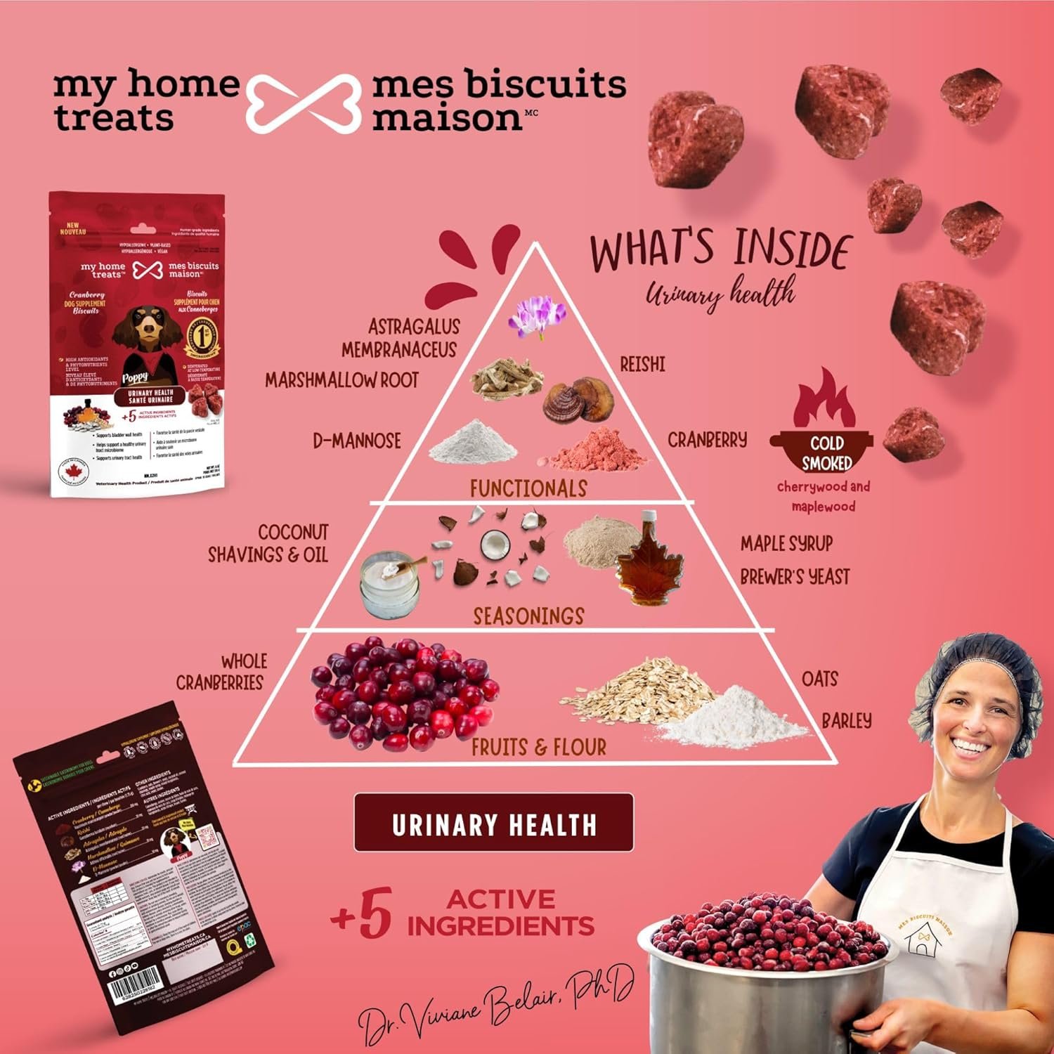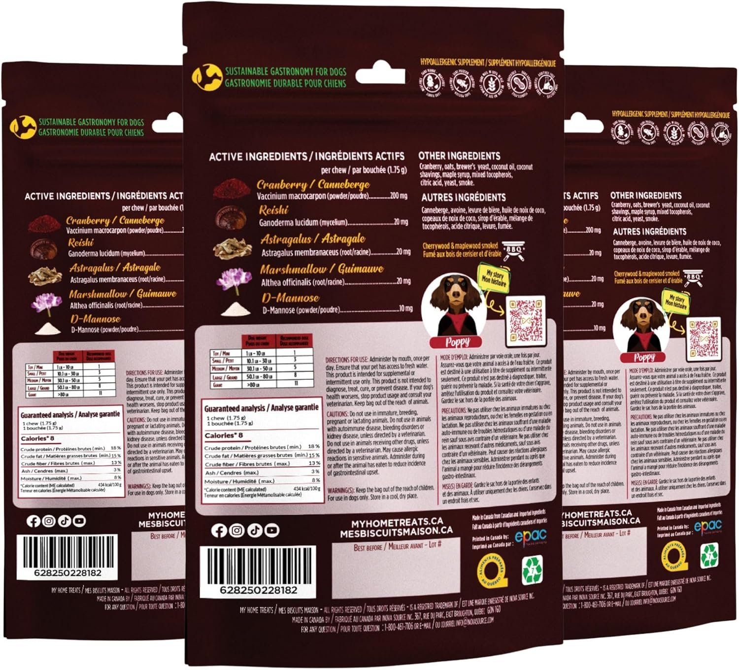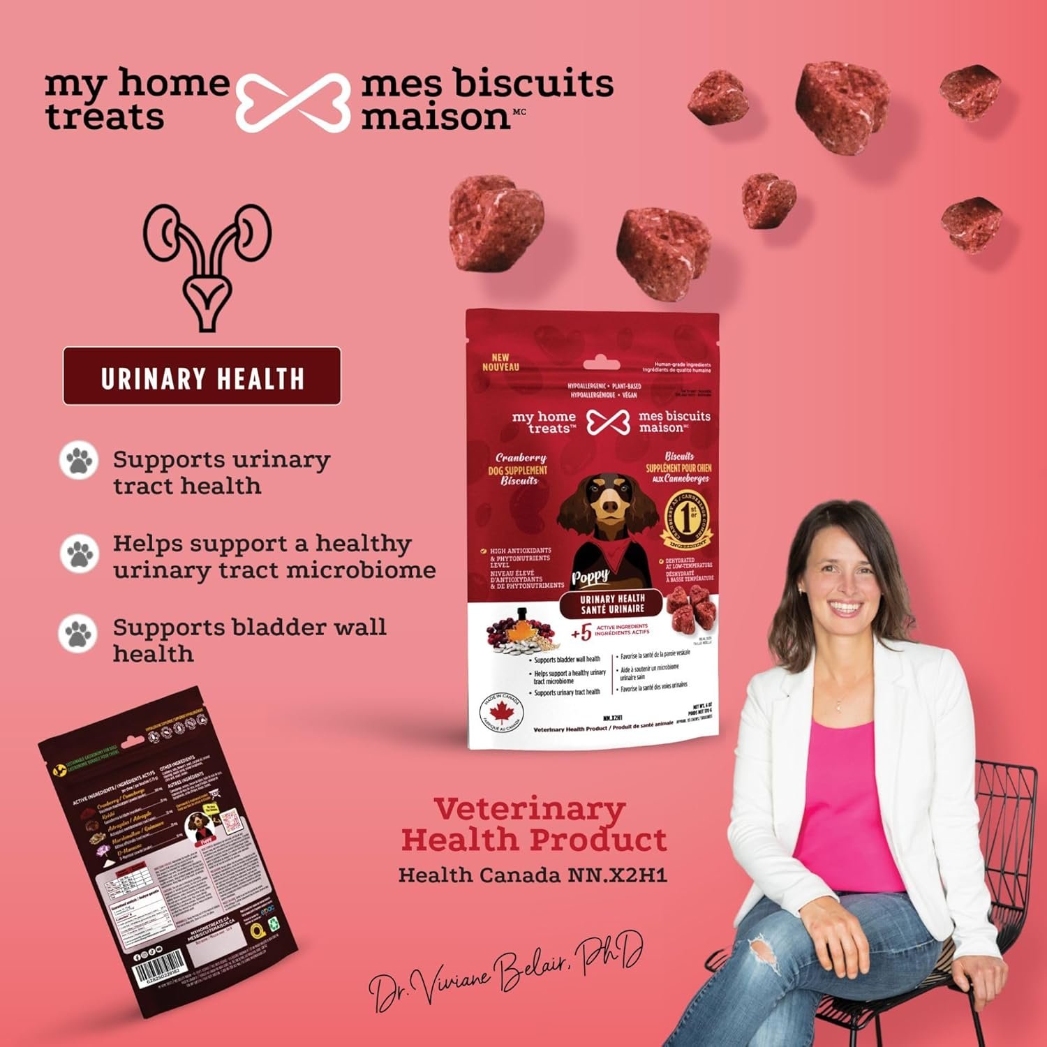 Promote urinary tract comfort and long-term bladder and kidney wellness with the Dog Urinary Health Supplement Bundle from My Home Treats. This 3-pack includes three 170 g bags of heart-shaped biscuits formulated to support urinary function, help reduce discomfort, and maintain a healthy bladder environment. Each biscuit delivers a targeted blend of cranberry, D-mannose, marshmallow root, reishi, and astragalus — ingredients known for promoting urinary tract resilience, flushing unwanted bacteria, and soothing sensitive urinary tissues. Cranberry and D-mannose help prevent bacterial adherence to bladder walls, while marshmallow root provides mucilage that supports comfort. Reishi and astragalus offer immune and kidney support. Crafted from hypoallergenic, human-grade, plant-based ingredients, these supplements are gentle enough for daily use and ideal for dogs experiencing urinary stress or needing preventive support. Approved by Health Canada (Veterinary Health Product No. NN.X2H1). Perfect for dogs prone to urinary discomfort, bladder sensitivity, or those requiring added kidney support.