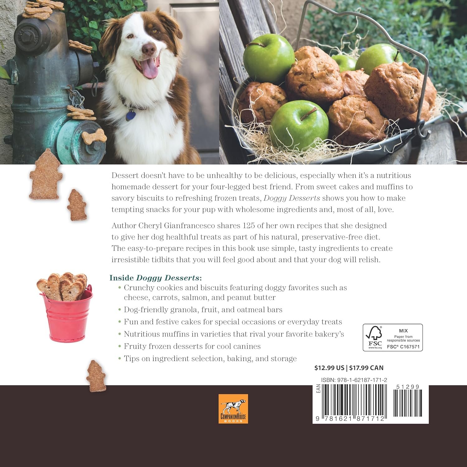 The marriage of two of the world’s favorite topics–dogs and desserts–Doggy Desserts offers dog owners over 100 recipes to spoil (and nourish) their pampered pooches. This beautifully photographed and designed book presents easy-to-do, fun recipes divided into six categories: cookies, bars, drop cookies, cakes, muffins, and frozen treats. For dog owners who are concerned about controlling what’s in their dogs’ food or who are looking to find low-cal, low-fat options for their slightly plump pups, Doggy Desserts provides many tasty options. From carob peanut butter crunch balls, sweet potato biscuits and liver oatmeal bones to granola bars, apple sauce spice cake, and watermelon dog sherbet, owners will be tempted to try each of these delectable delights before serving to their dogs. The author, Cheryl Gianfrancesco is an avid cook and dog lover, and cooking for her dogs is her favorite passion! Dog owners looking to feed their dogs healthy homemade treats will find: How to make your own tasty, wholesome doggie snacks and desserts More than 100 easy-to-do recipes Goodies your dogs will not only enjoy but are also good for them Healthy, tasty, and easy to make with ingredients commonly found around the house Strategies to avoid preservatives and ingredients that can irritate sensitive canine tummies and cause allergies and other health problems Low-cal, low-fat options for overweight dogs Sections on cookies, bars, drop cookies, cakes, muffins, and frozen treats