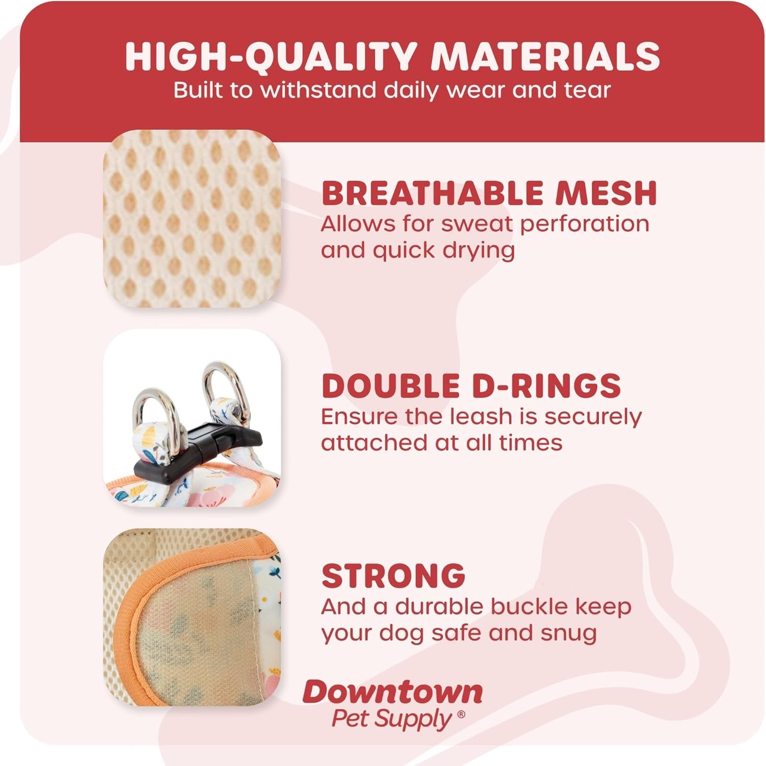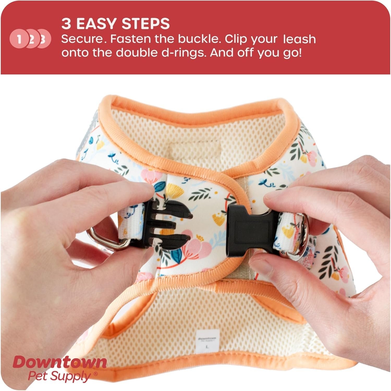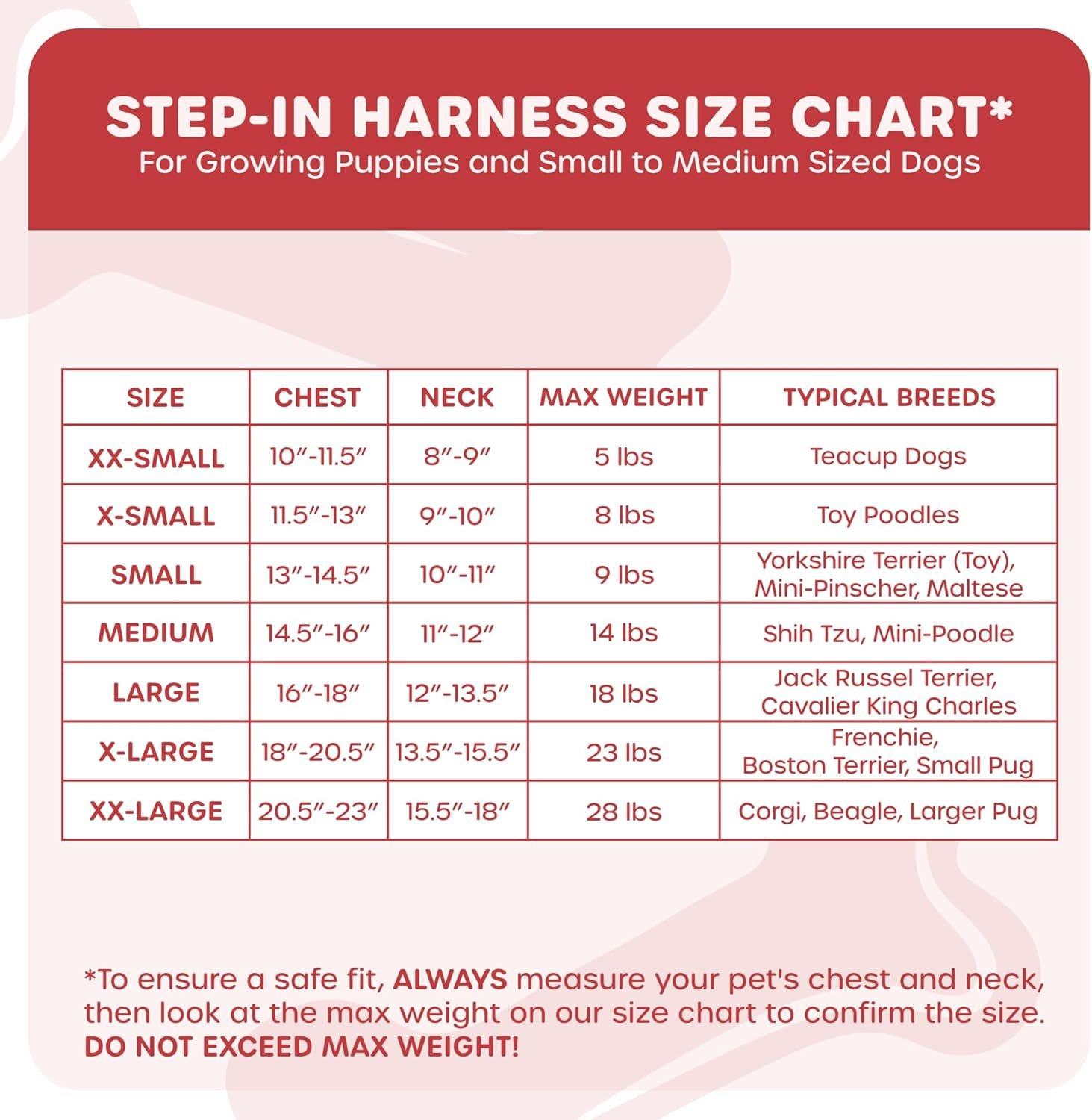 FEATURES GUARANTEED TO FIT: Review the SIZE CHART in the support image on the left. If the harness doesnt fit your pup, well exchange it free of charge! EASY STEP-IN DESIGN: Effortlessly slip this harness on and off your pup in seconds. Simply (1) Step In and Close the Velcro (2) Push the Buckle Together (3) and Off you Go with a Click! Adjustable design fits better than traditional harnesses! TOTAL COMFORT: Padded design reduces tugging and pulling on your pups neck. While breathable mesh fabric dries quickly and is ideal for all types of weather. DESIGNED TO LAST: Triple security features double stitched fabric, strong velcro closure, and heavy duty metal D-rings make for a secure leash attachment and allows you to walk your pup in confidence. X-SMALL: Fits 11 – 12″ chest, 9 – 10″ neck SMALL: Fits 14 – 15″ chest, 11 – 12″ neck MEDIUM: Fits 16 – 17″ chest, 11 – 12″ neck LARGE: Fits 18 – 19″ chest, 14 – 17″ neck X-LARGE: Fits 20”-23” chest, 18”-22” neck