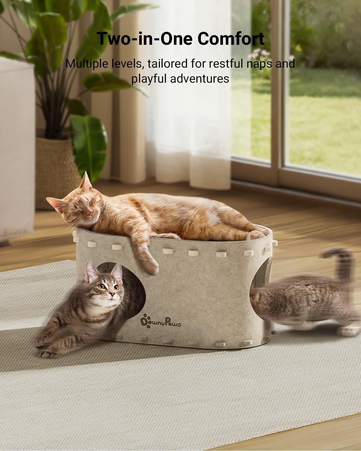Multi-Level Bliss for Multi-Cat Families: Double-decker design, because every cat deserves their own turf without resorting to paw-to-paw combat. Moreover, the dual openings foster group play, peek-a-boo games, and positive interactions, while offering safe observation points to maintain social hierarchies and awareness of surroundings.