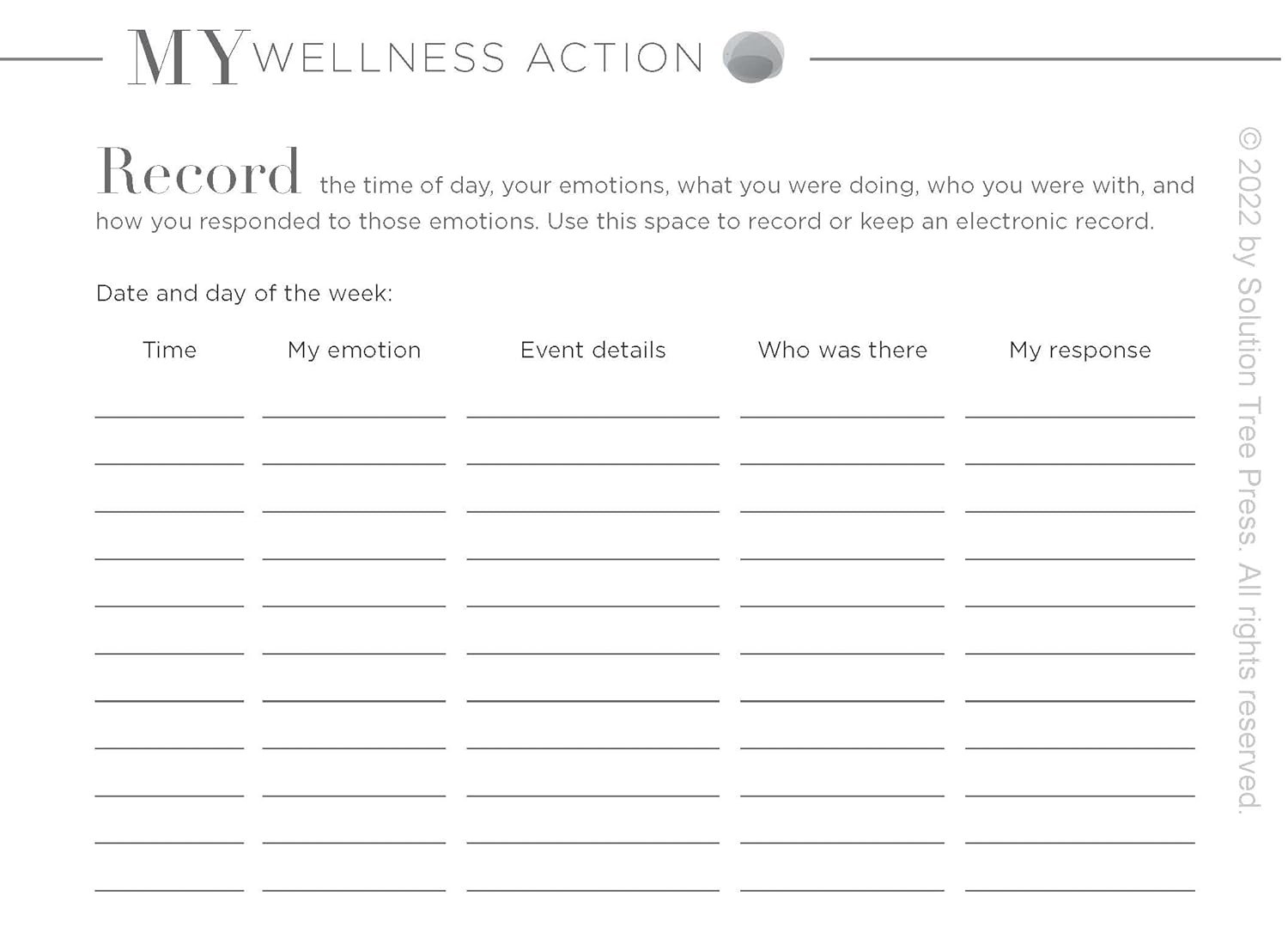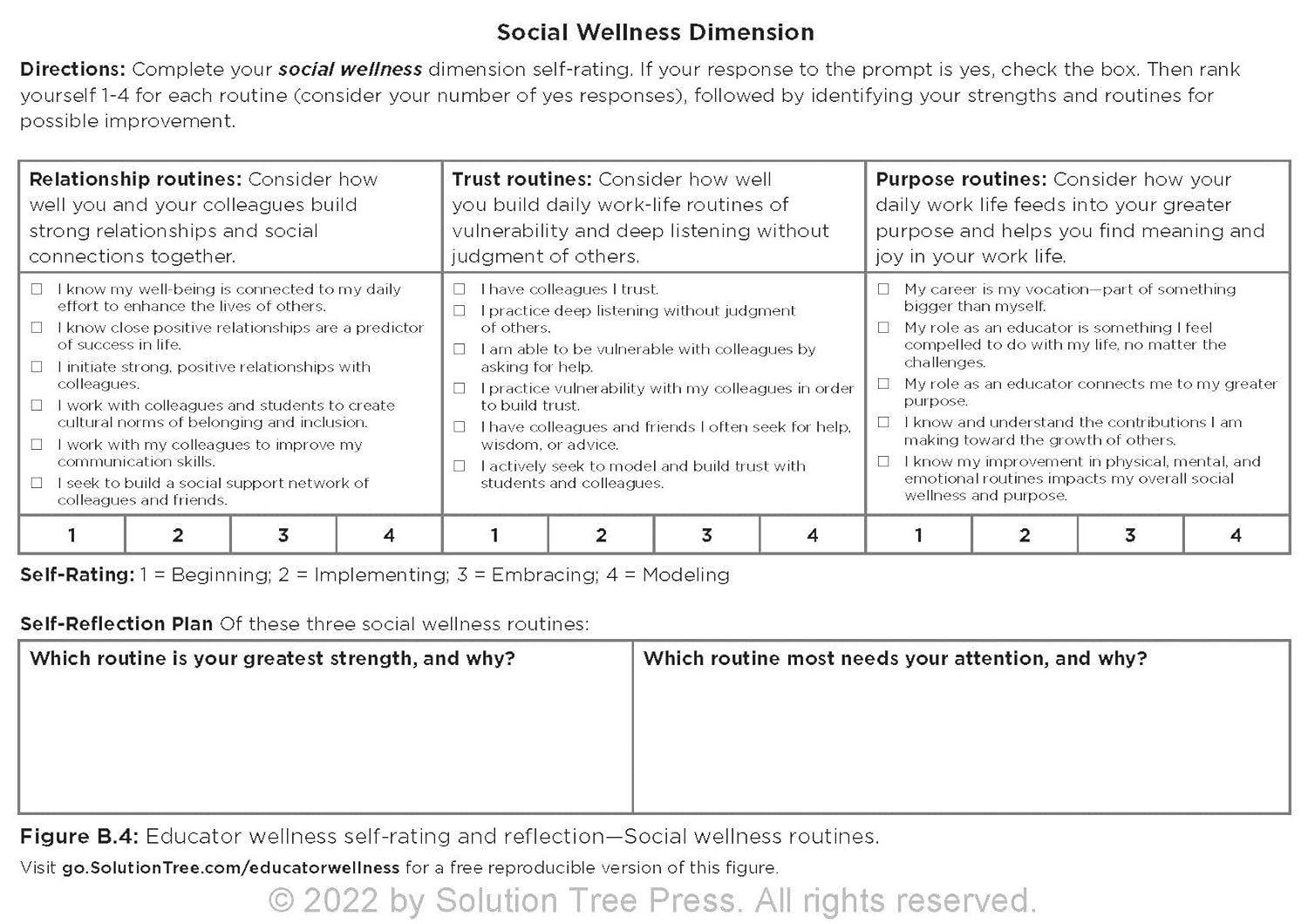 Use this resource on your own or as a book study to guide staff through a reflective, goal-setting process. Observe the importance of self-care for teachers and other educators and how a commitment to daily self-care and well-being leads to a more fulfilling, successful life in and outside of the school setting.Review the four dimensions of educator self-care and wellness–(1) physical, (2) mental, (3) emotional, and (4) social–and 12 corresponding routines.Explore self-care activities for teachers and educators to sustain well-being in the face of workplace overload and potential burnout.Use the My Wellness Action journaling spaces designed to encourage thoughtful reflection to wellness and self-care plans for teachers and educators.Learn how to monitor your self-care progress and design an actionable wellness plan for next steps.View videos that highlight the authors’ personal experiences with the four dimensions of educator or teacher well-being.Access the Educator Wellness–Rating, Reflecting, Planning, and Goal-Setting protocol.