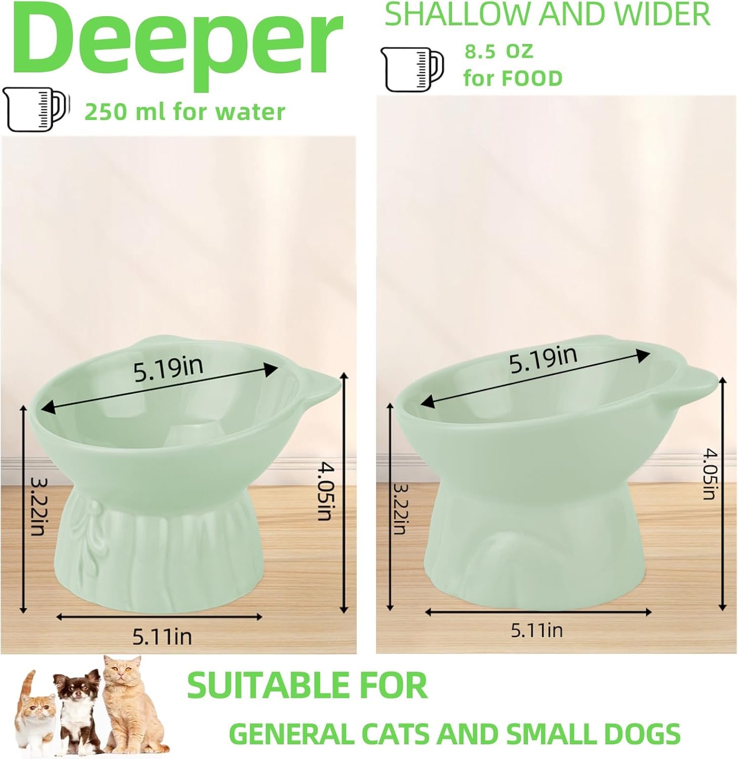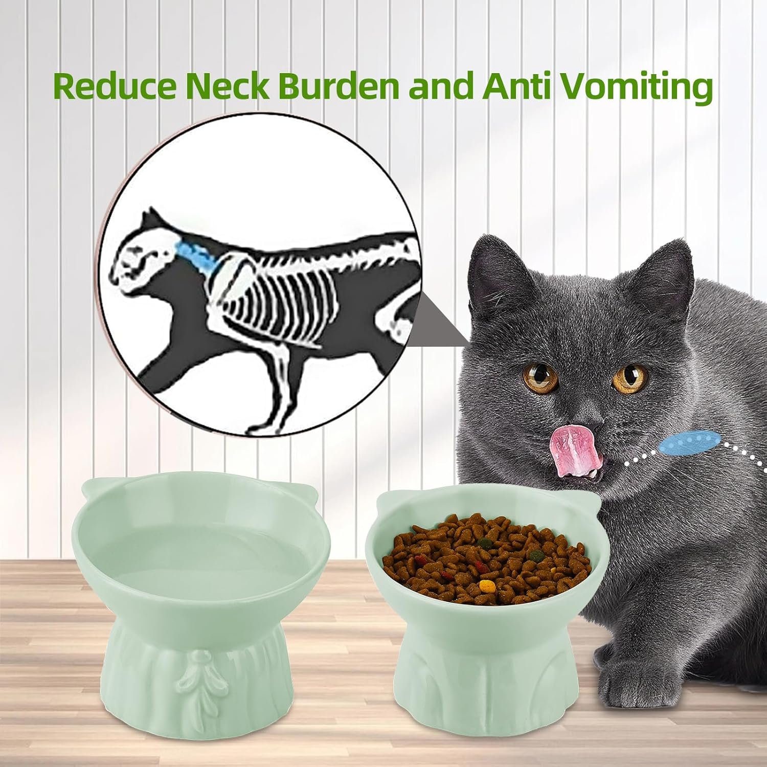 Elevated Cat Bowls 2-Pack, Ceramic Raised Cat Food & Water Dishes – Extra Wide & Shallow Whisker-Friendly Design, Anti-Vomit & Easy Digestion, Lead/Cadmium-Free, Microwave & Dishwasher Safe (Green)