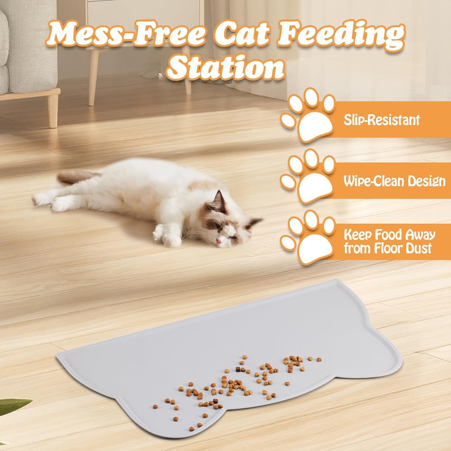 NON-SLIP FOOD MAT + STABLE STAINLESS STEEL STAND: Equipped with a thick non-slip mat that catches crumbs and spilled water, keeping floors tidy and easy to clean. The weighted stainless steel stand enhances stability, preventing tipping or sliding even when playful pets eat enthusiastically