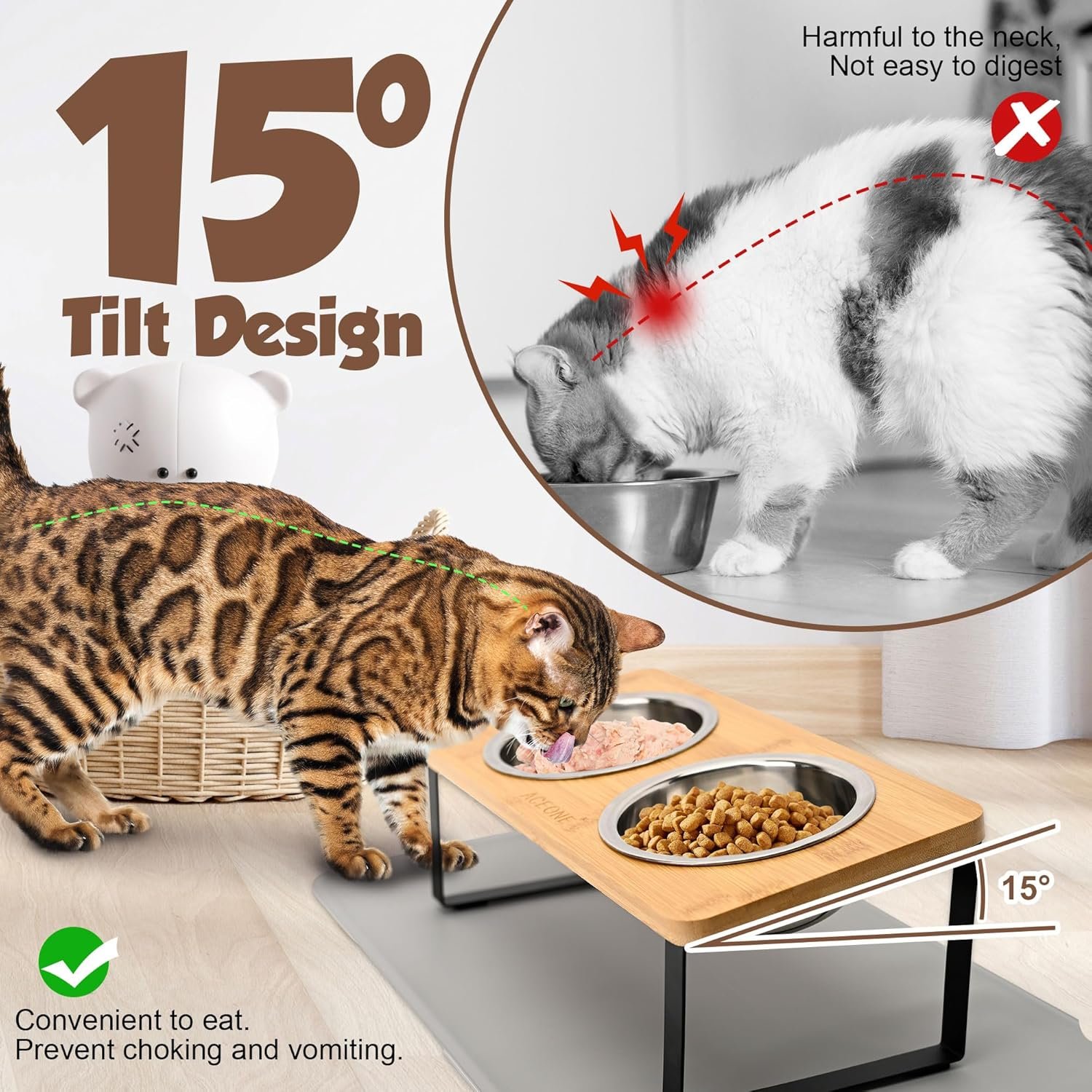 Elevated Cat Bowls with Non Slip Mat, 15° Tilted Raised Anti Vomit Cat Feeder for Food and Water, Pet Feeding Station with 2 Stainless Steel Bowls