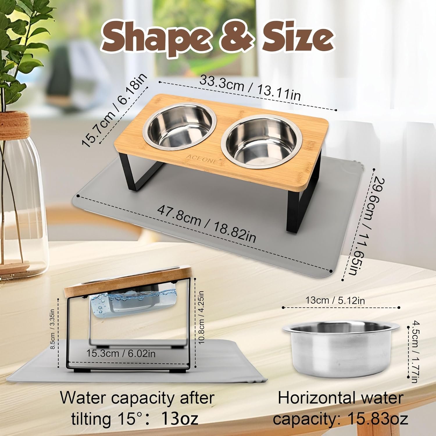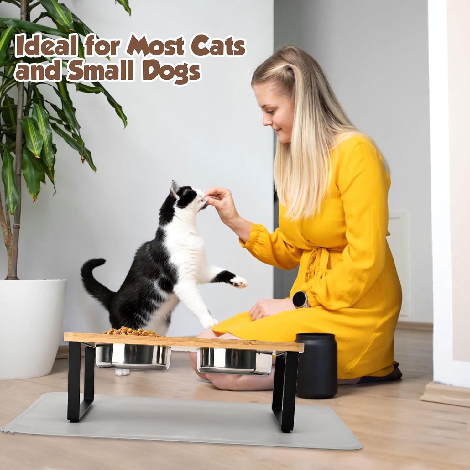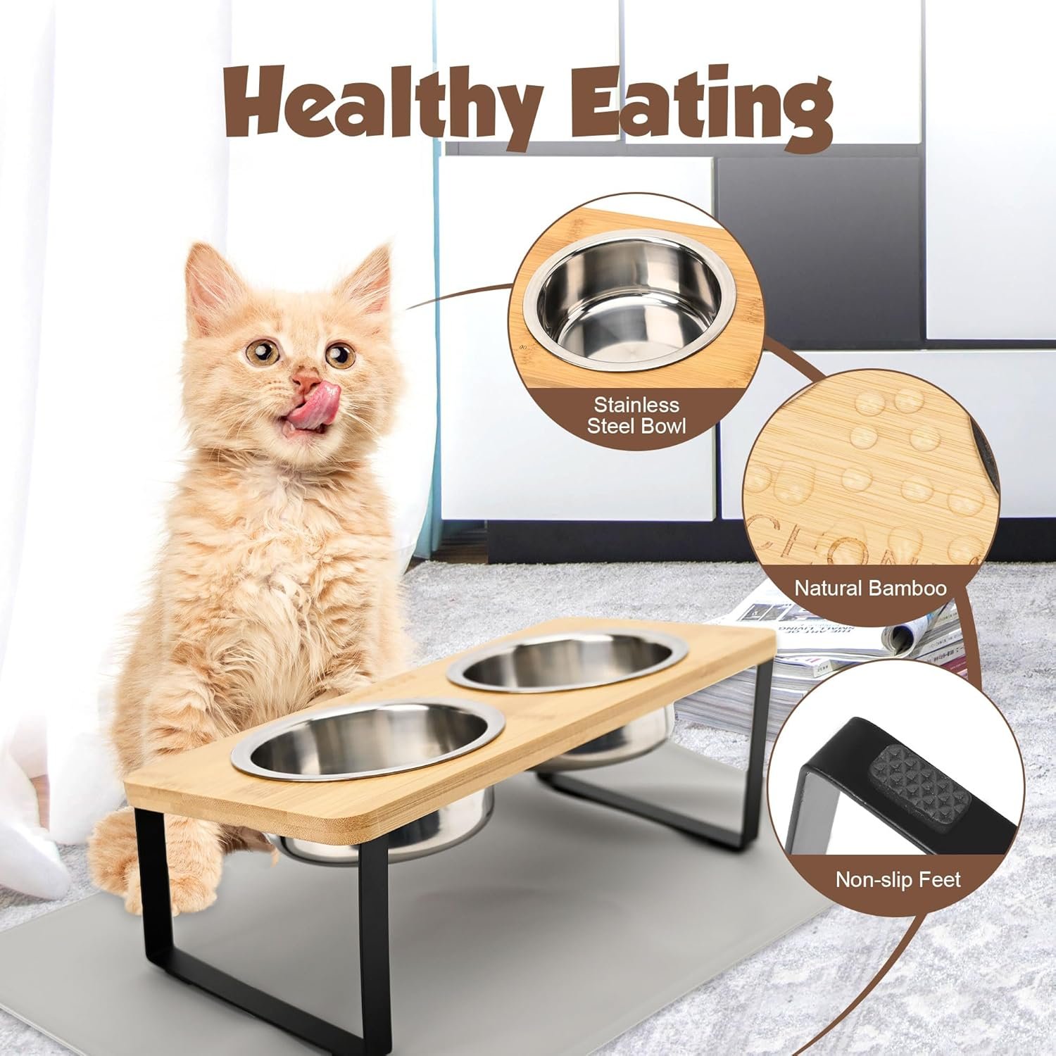 【Elevated Cat Bowl with Mat】 Raised cat food bowls with natural bamboo stand, 2 Stainless Steel cat bowls. The elevated position discourages cats from playing with food or splashing water.