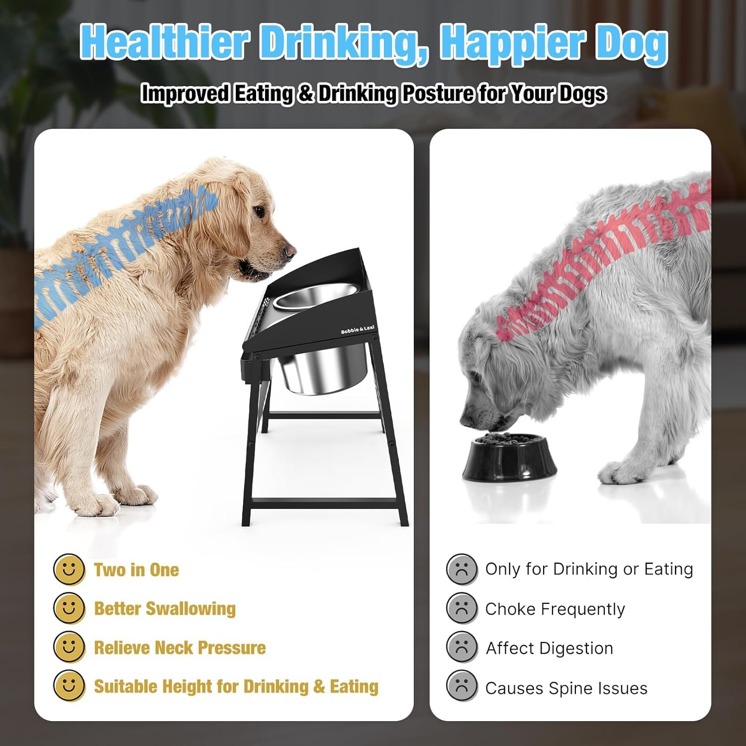 Ergonomic Designed for Dog’s Spinal Protection: Unlike other dog feeding station, our large dog elevated food and water bowl features a dog bowl stand that helps promote a healthier drinking posture for a happier, healthier pet. This design encourages slower drinking and eating, reducing strain on your dog’s spine and joints. By providing proper elevation, it enhances overall comfort and well-being during mealtime.