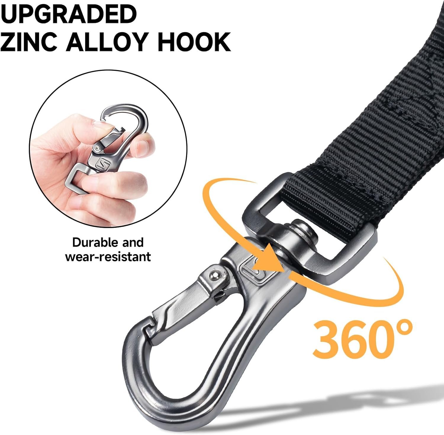 Metal hook and adjustable rectangular clasp.The metal hook of this tactical training leash can be attached to dog vest or collar,it can withstand up to around 200 kg tensile after testing. Rectangular metal buckle is used to adjust the length of the handle,clasped dog leash on your belt, or temporarily lock your dog on somewhere when you have to go away.