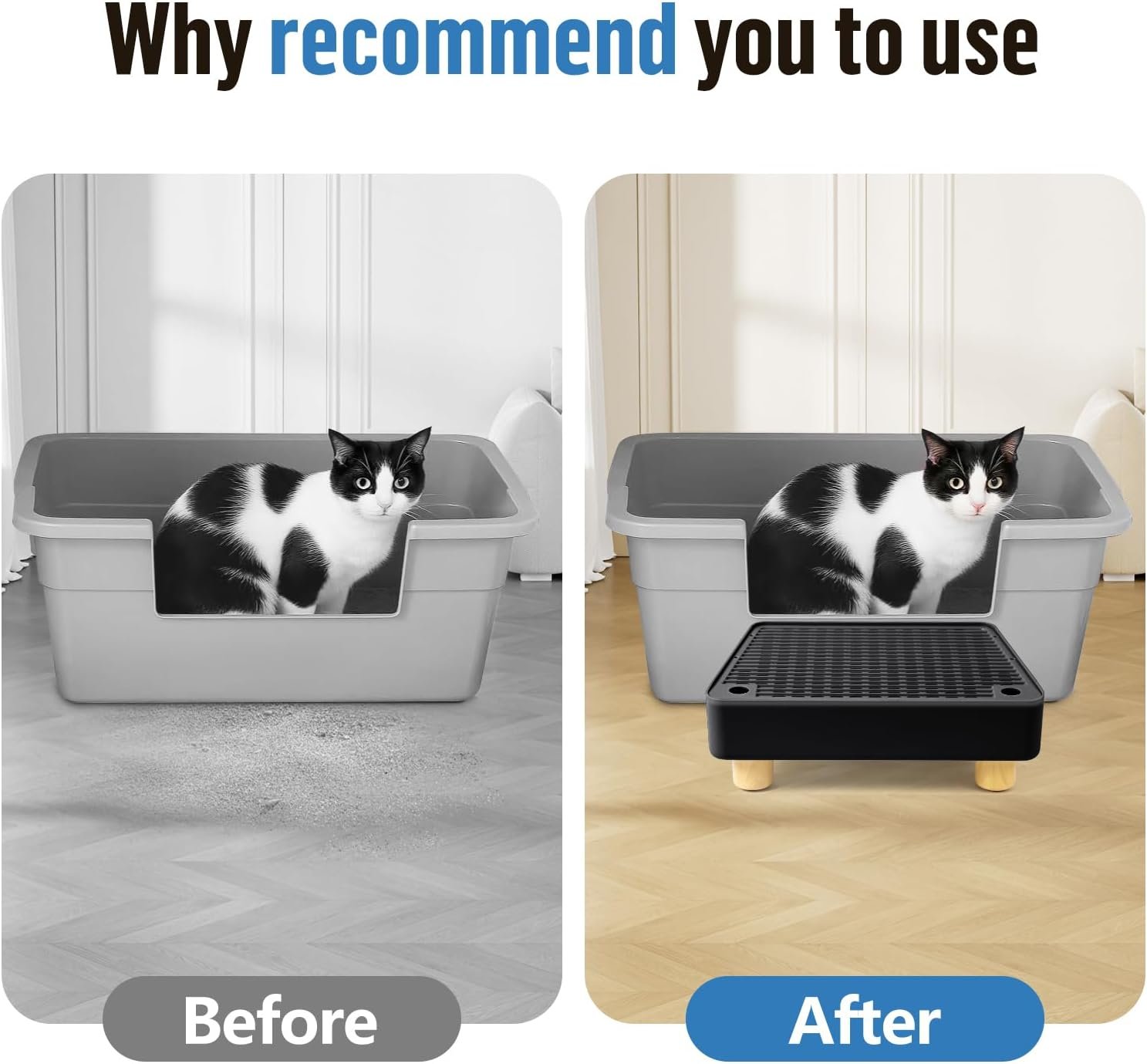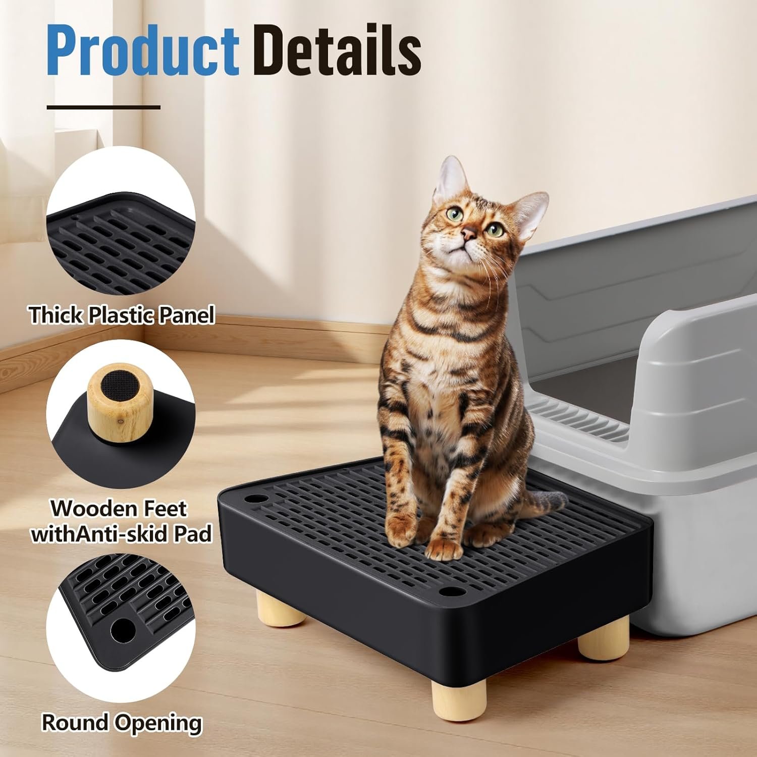 Extra Large Cat Litter Box Step Ramp, Cat’s Litter Catcher Mat with Wooden Feet, Filter Function, Pedal Stool for Self-Cleaning Cat Litter Box, Ideal for Kitten & Elderly Cats (Black)