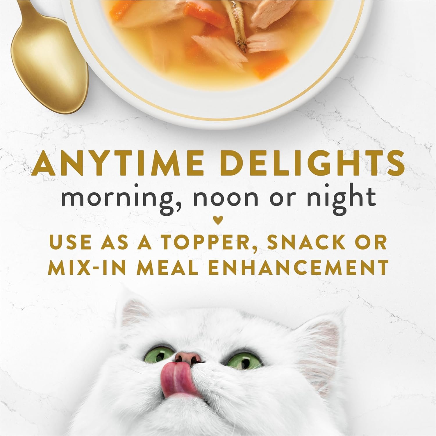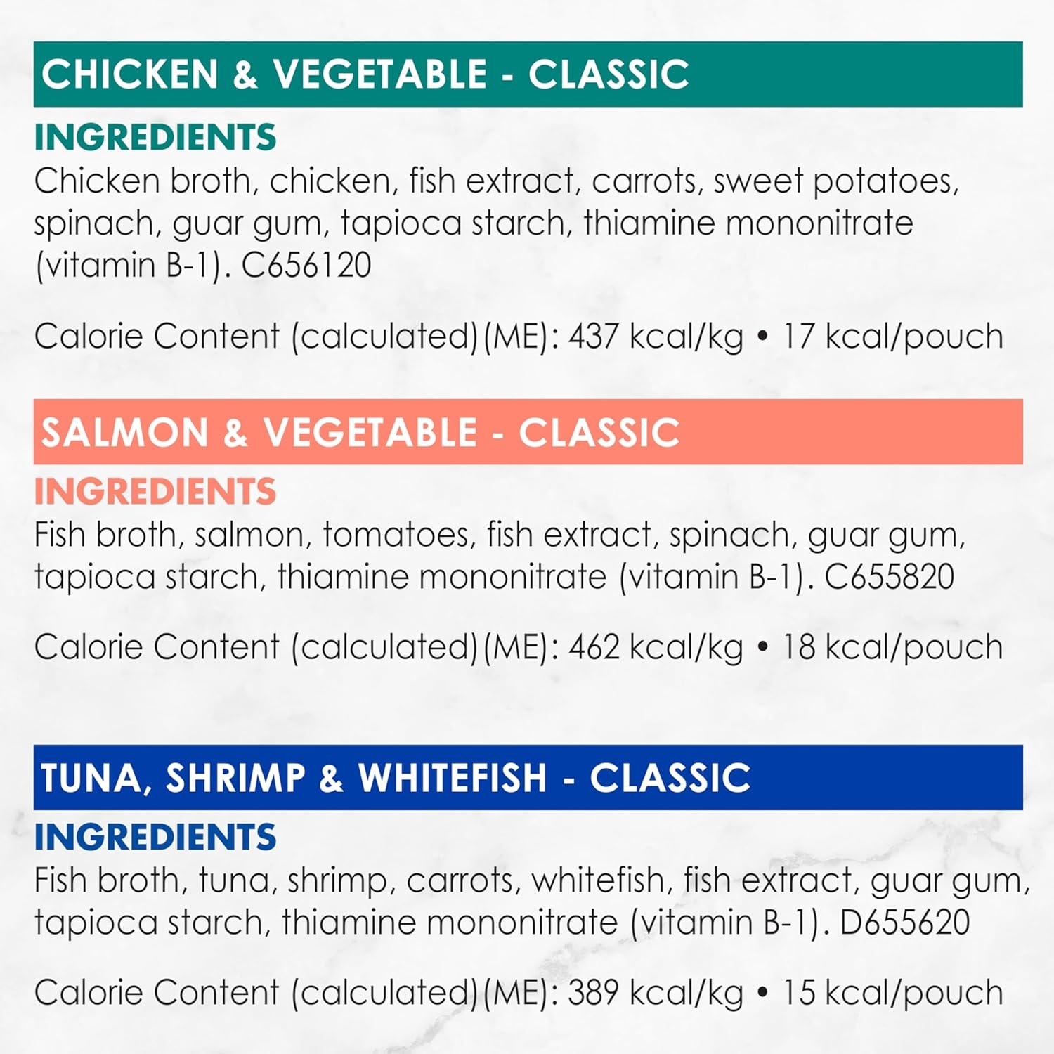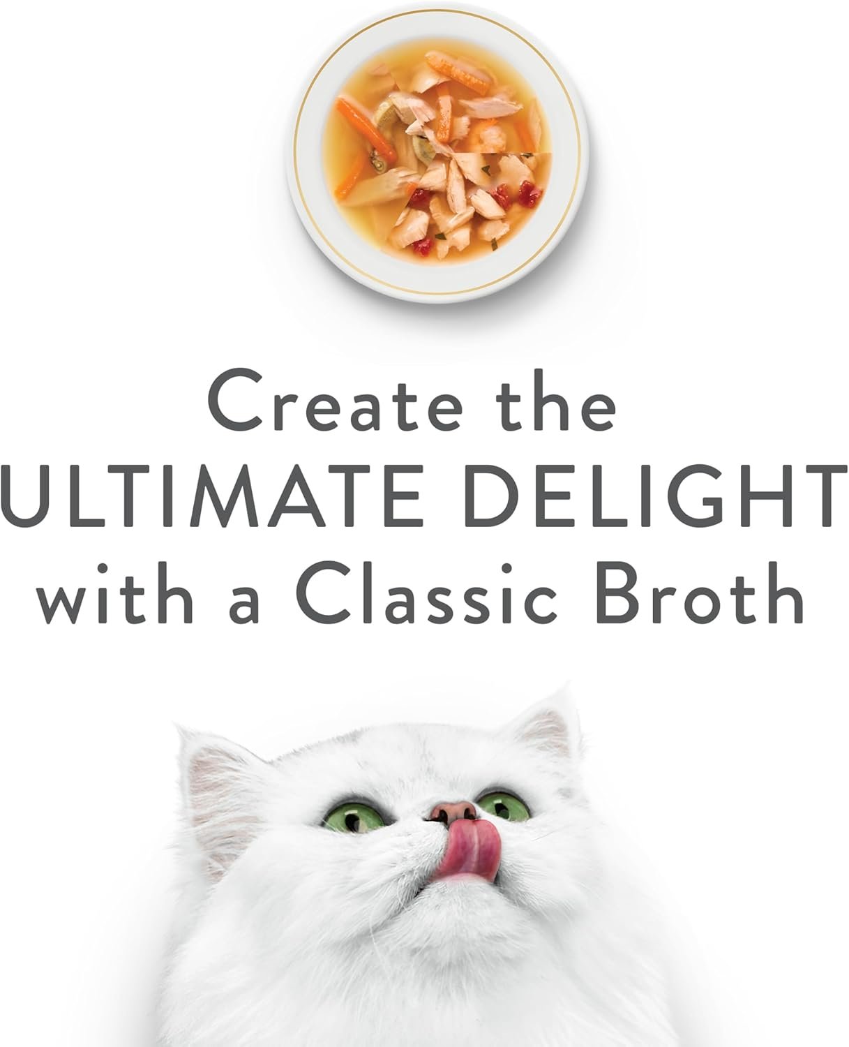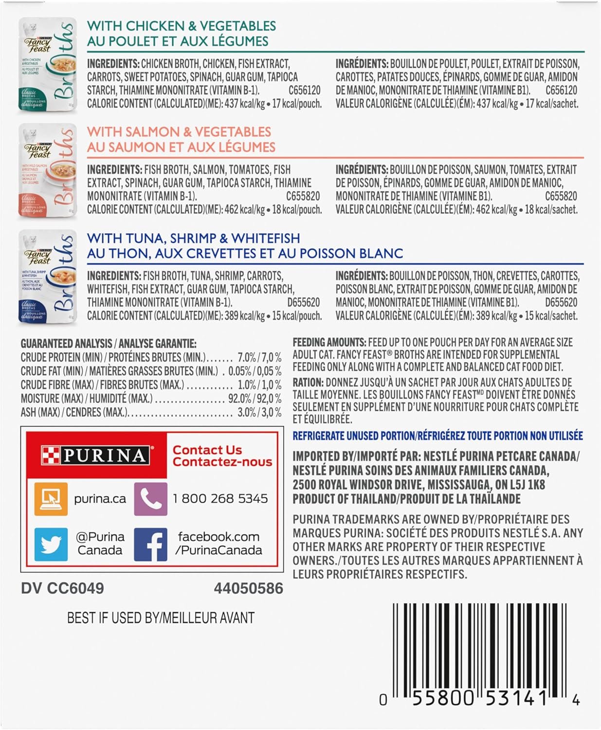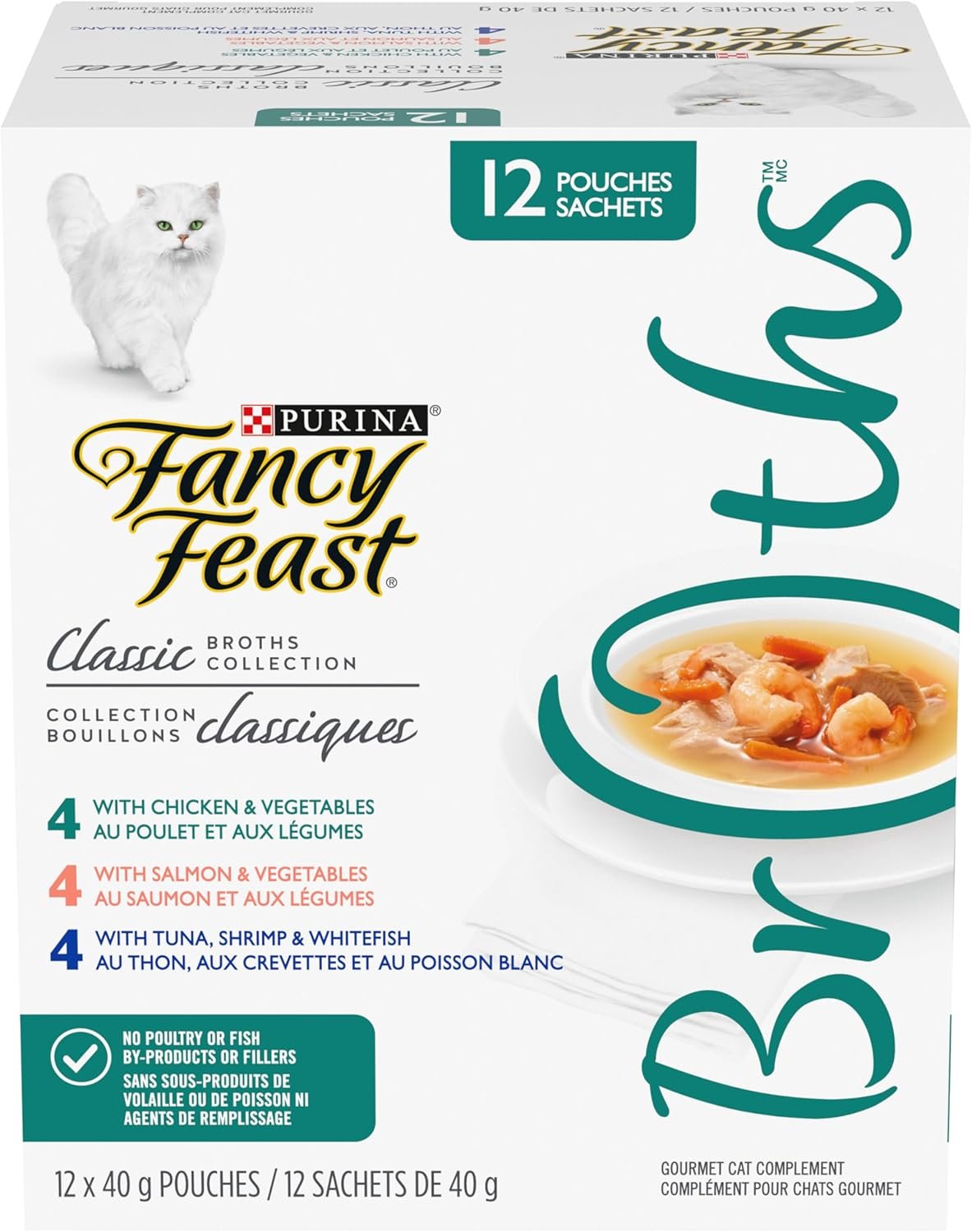 Contains 4-40g Pouches of Chicken & Vegetables, 4-40g Pouches of Salmon & Vegetables & 4-40g Pouches of Tuna, Shrimp & Whitefish Gourmet Cat Complement. Real, recognizable ingredients are at the heart of every Fancy Feast® Broths recipe. Each perfectly portioned, ready to pour pouch includes a variety of lickable, lappable, tastes and textures in a decadent broth cats are sure to love.