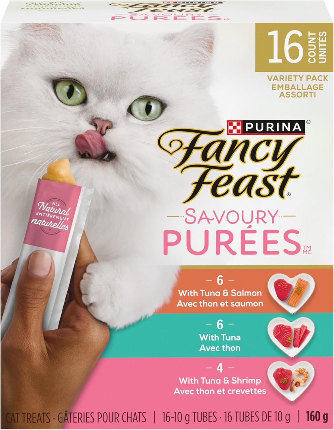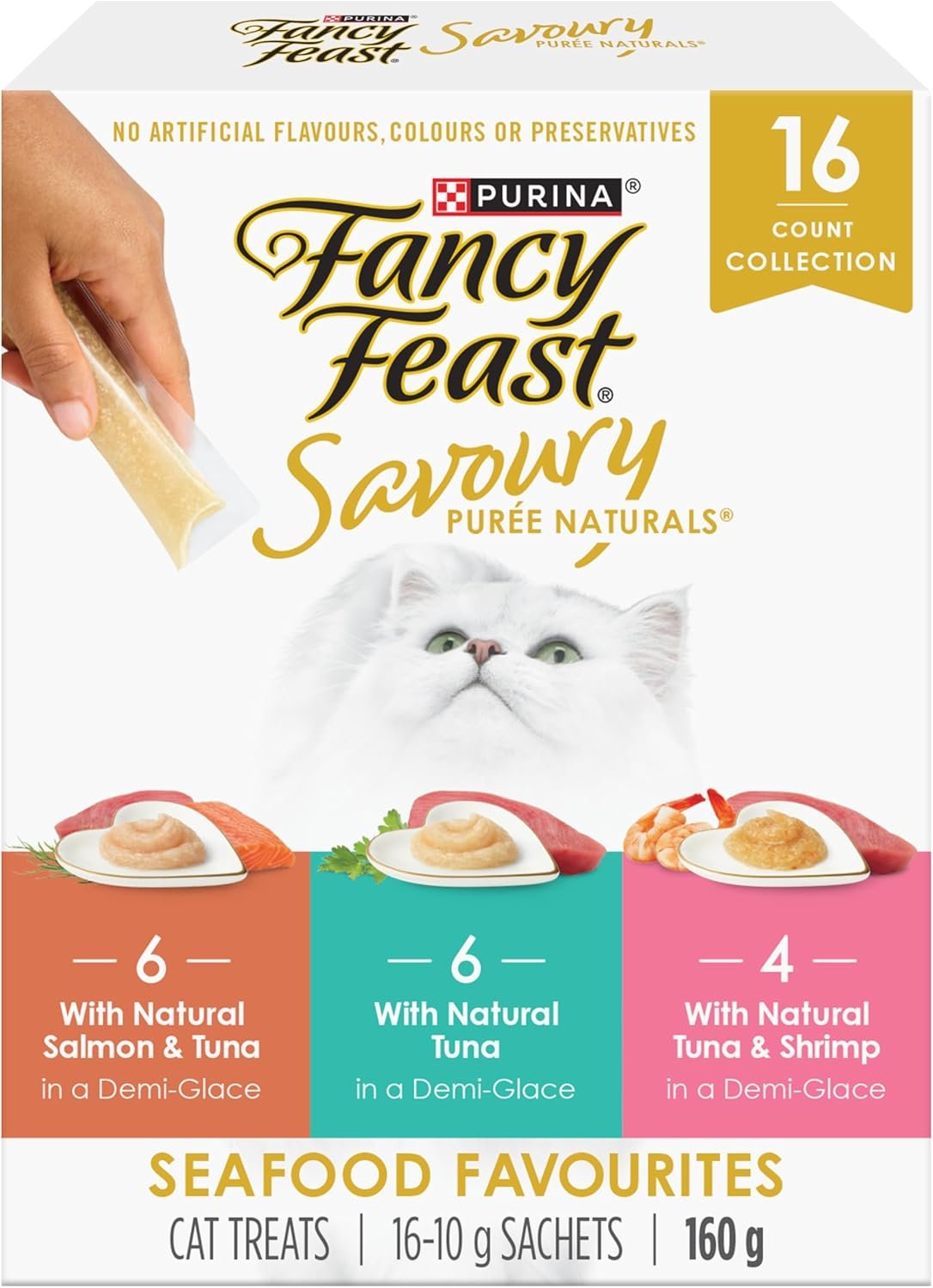 Fancy Feast Savoury Purée Naturals Cat Treats, Seafood Favourites Variety Pack – 10 g x 16 Sachet (1 Pack)