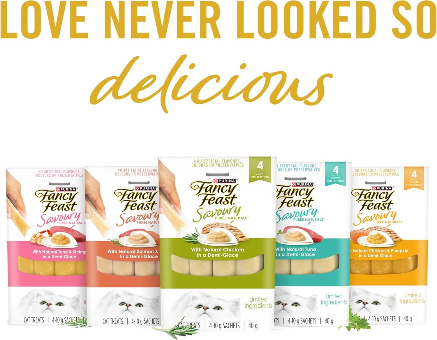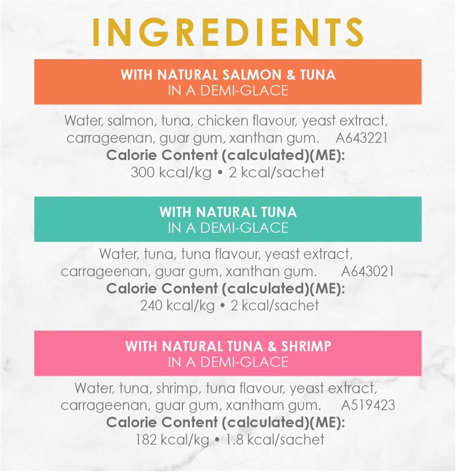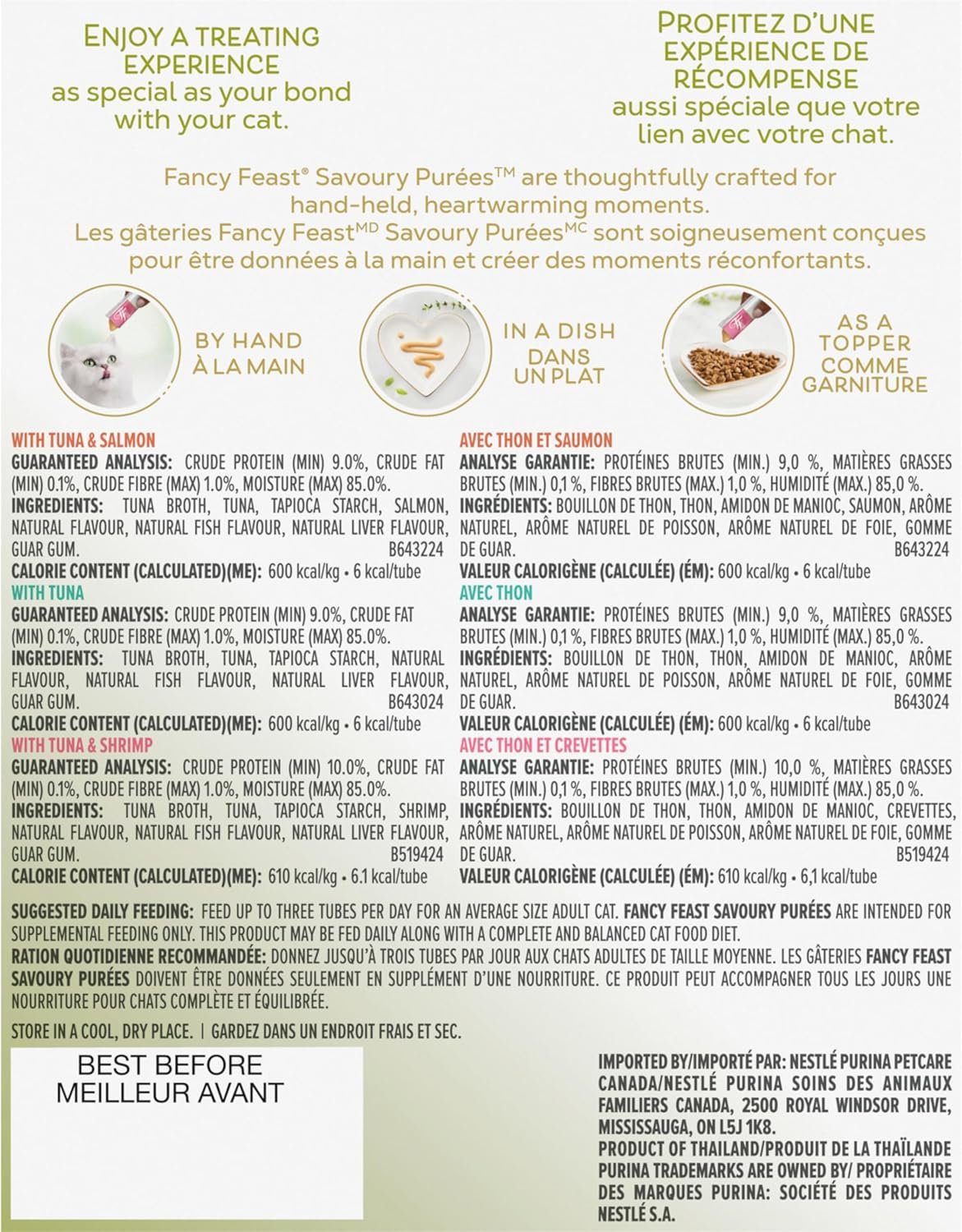 Love never looked so delicious. Your cat will love this tasty natural treat made with hand-selected tuna, salmon & tuna, and tuna & shrimp recipes in a demi-glace. Made without artificial colours, flavours or preservatives, this grain-free treat will delight your cat and create a special moment in one of three ways – by hand, in a bowl, or as a topper!