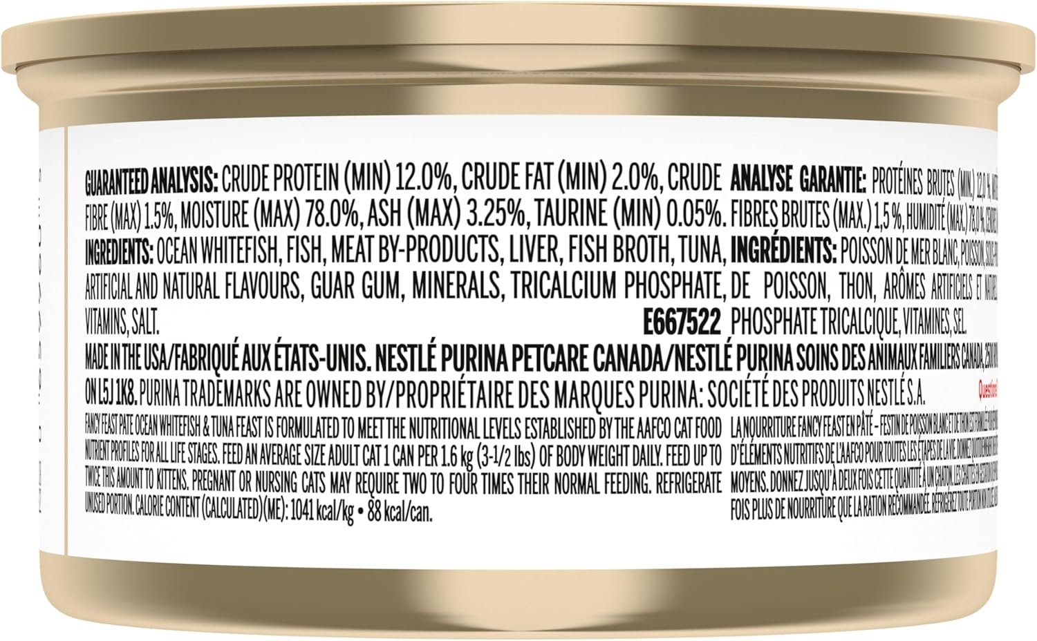 A deliciously smooth savory pate made with ocean whitefish and tuna. Fancy Feast Pate Ocean Whitefish and Tuna Feast is formulated to meet the nutritional levels established by the AAFCO Cat Food Nutrient Profiles for the growth and maintenance of cats.