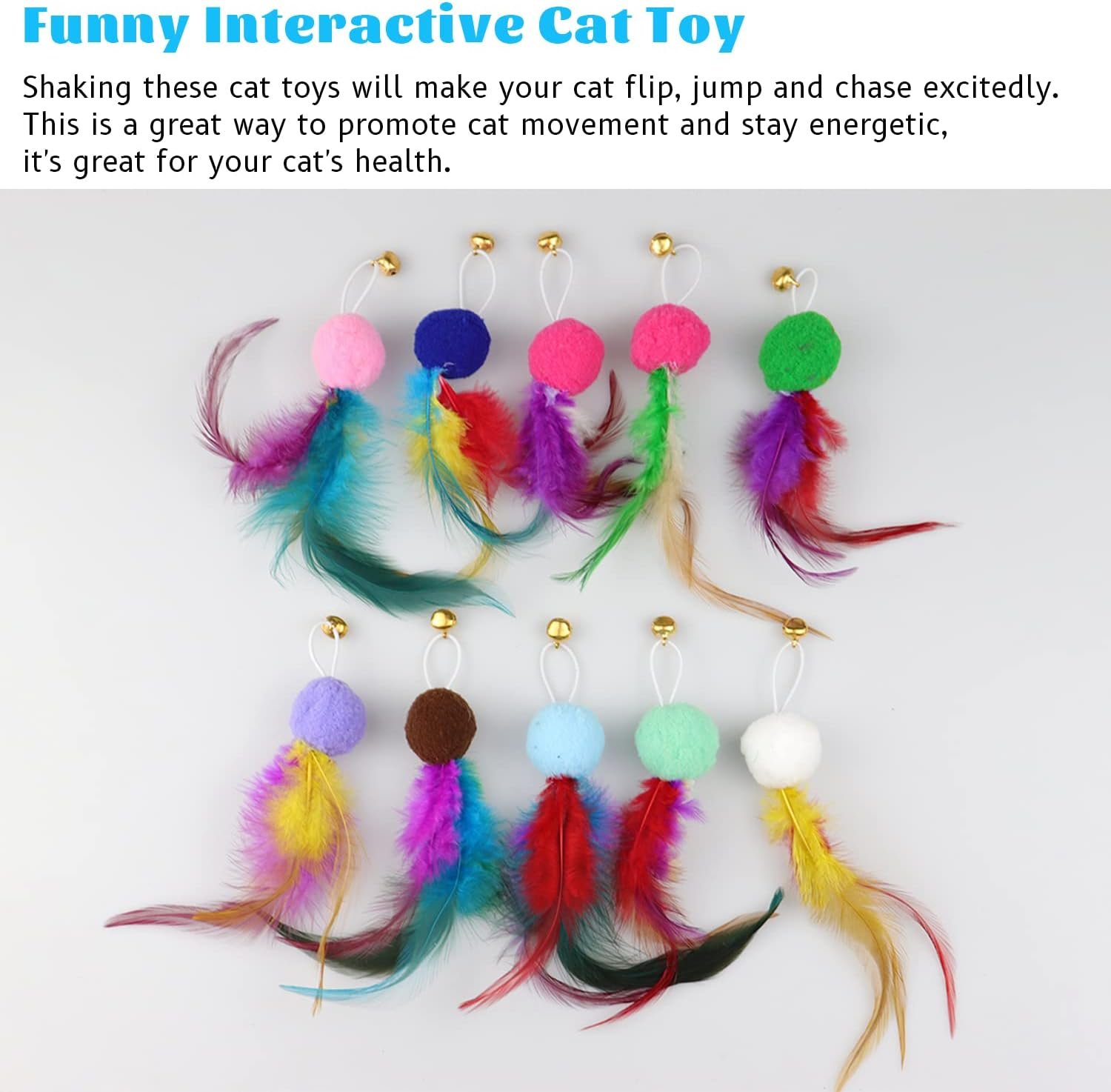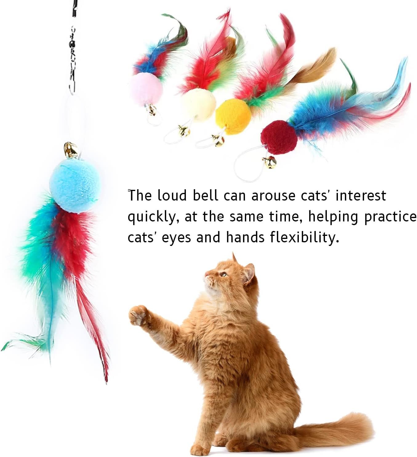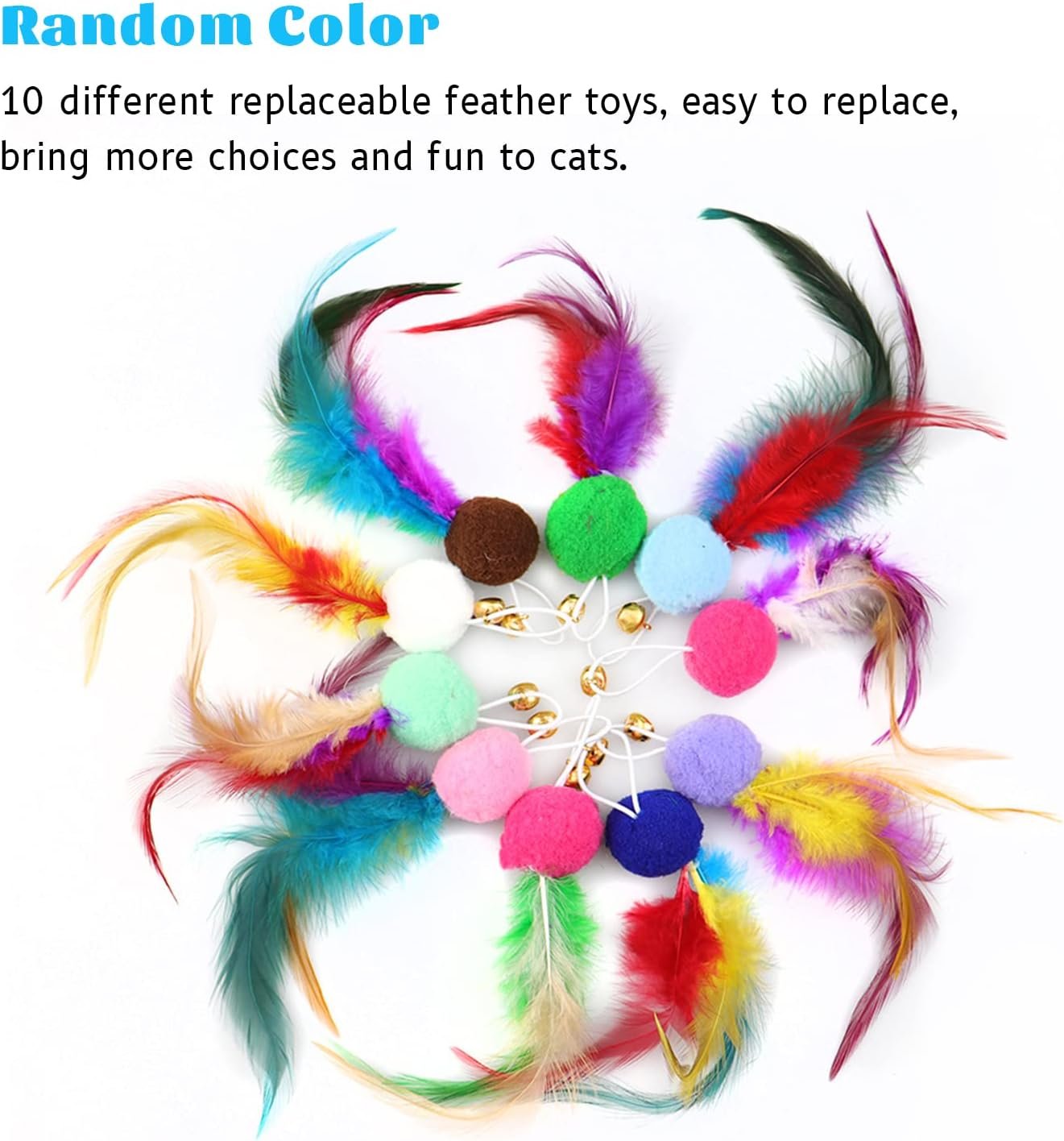 【Multiple Replaceable Feathers】10 different replaceable feather toys, easy to replace, bring more choices and fun to cats.the loud bell can arouse cats’ interest quickly, at the same time, helping practice cats’ eyes and hands flexibility.