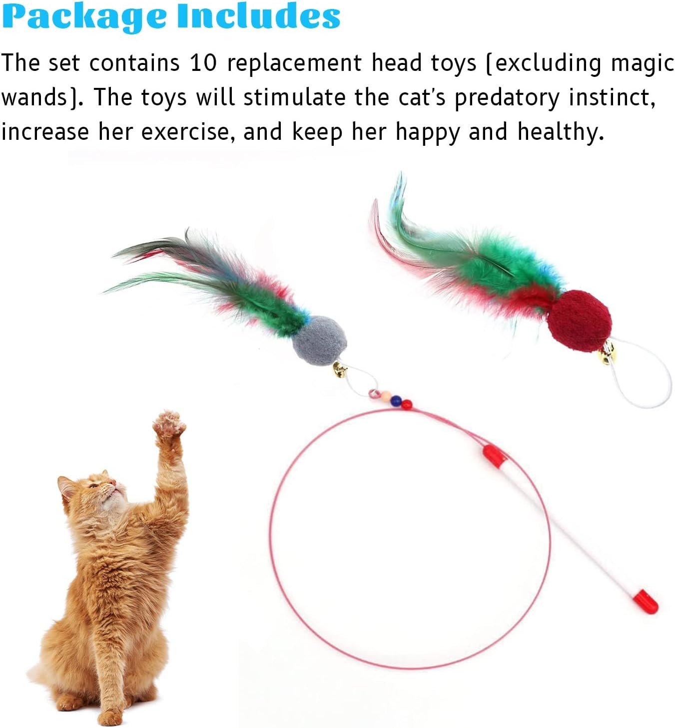 【Package includes】The set contains 10 replacement head toys (excluding magic wands).the toys will stimulate the cat’s predatory instinct,increase her exercise, and keep her happy and healthy.