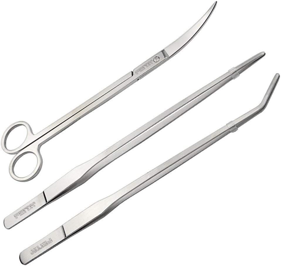 FEITA Aquarium Tweezer Set Long Stainless Steel Curved & Straight Aquarium Feeding Tweezers Scissors Maintenance Tools Kit (3 Pcs)