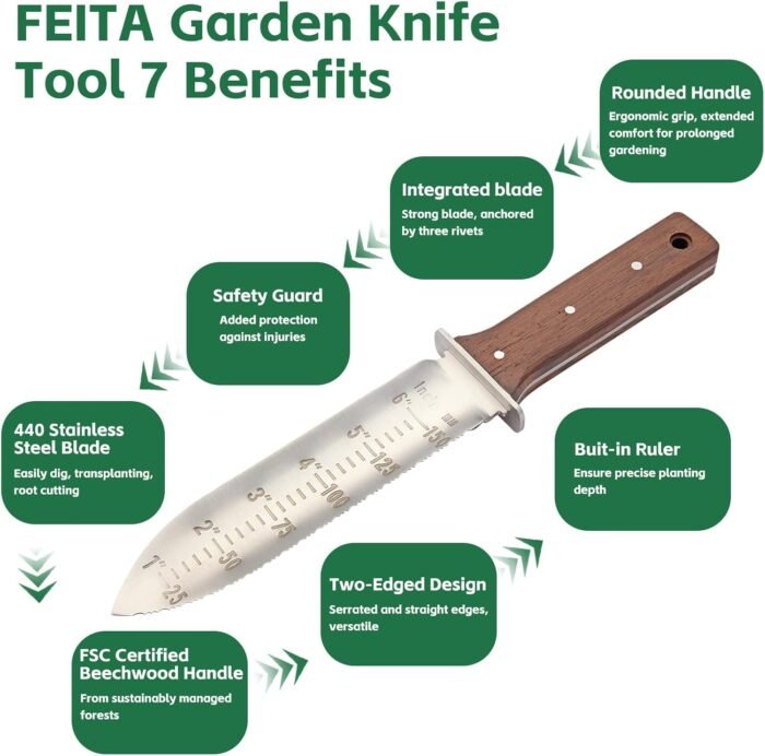✔ DUAL-SIDED BLADE: One is sharp serrated sawing edge, and the other is a razor-sharp cutting edge, FEITA Gardening Trowel offers versatility. Depth scale markings ensure precise planting and measuring.