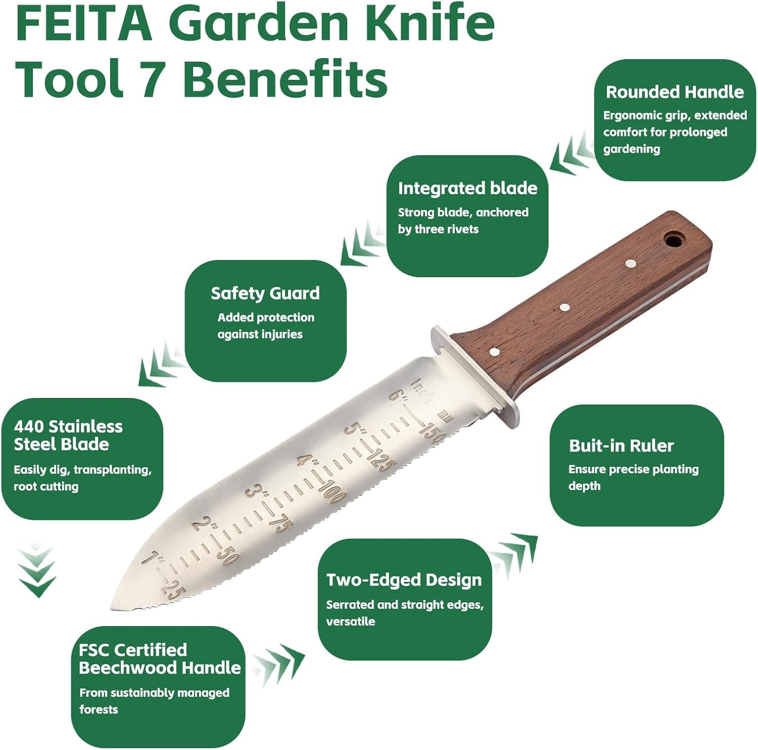 FEITA hori hori gardening knife is always used in gardening such as weeding, cutting roots, transplanting, removing plants, and splitting perennials.