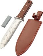 FEITA Hori Hori Garden Knife with Leather Sheath and Sharpening Stone, 7.1 Inches Stainless Steel Blade, Serrated Side Garden Soil Knife Tools for Gardening, Weeding, Planting, Digging (Wenge)
