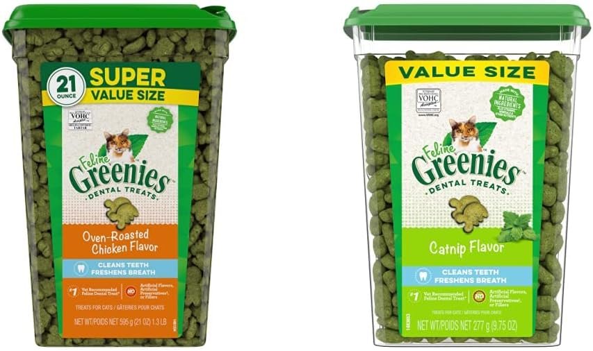Contains one (1) 21 oz. tub of FELINE GREENIES Dental Natural Treats for Cats Oven Roasted Chicken Flavor and one (1) 277g tub of FELINE GREENIES Adult Dental Cat Treats, Catnip Flavour