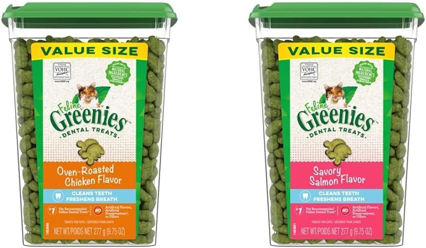 Contains: One (1) 277g tub of FELINE GREENIES Adult Dental Cat Treats, Oven Roasted Chicken Flavour and one (1) 277g tub of FELINE GREENIES Adult Dental Cat Treats, Savory Salmon Flavour