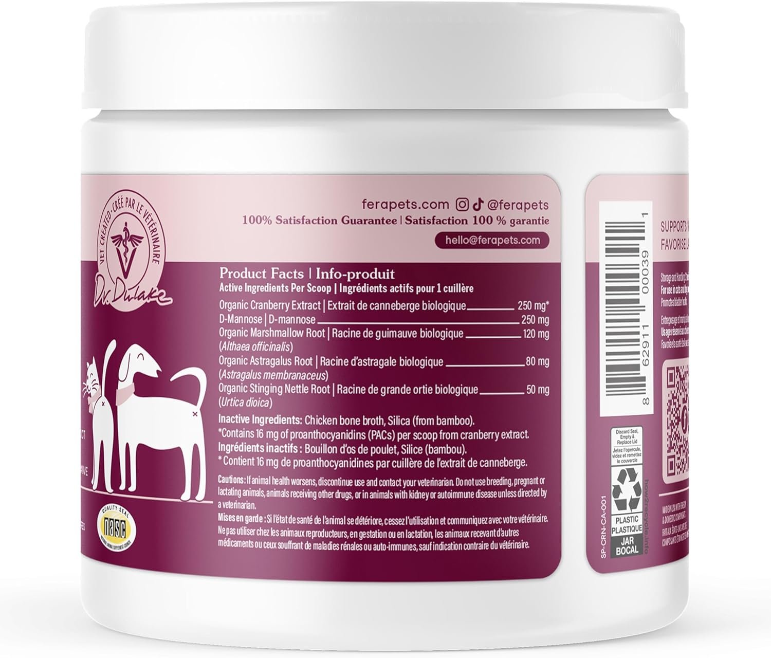 Veterinarian formulated: Cranberry supplement for dogs and cats crafted by our Co-Founder, Veterinarian Dr. Dulake; bears the NASC quality seal, made in the USA, GMP-compliant, and doesn’t contain colors, dyes or preservatives