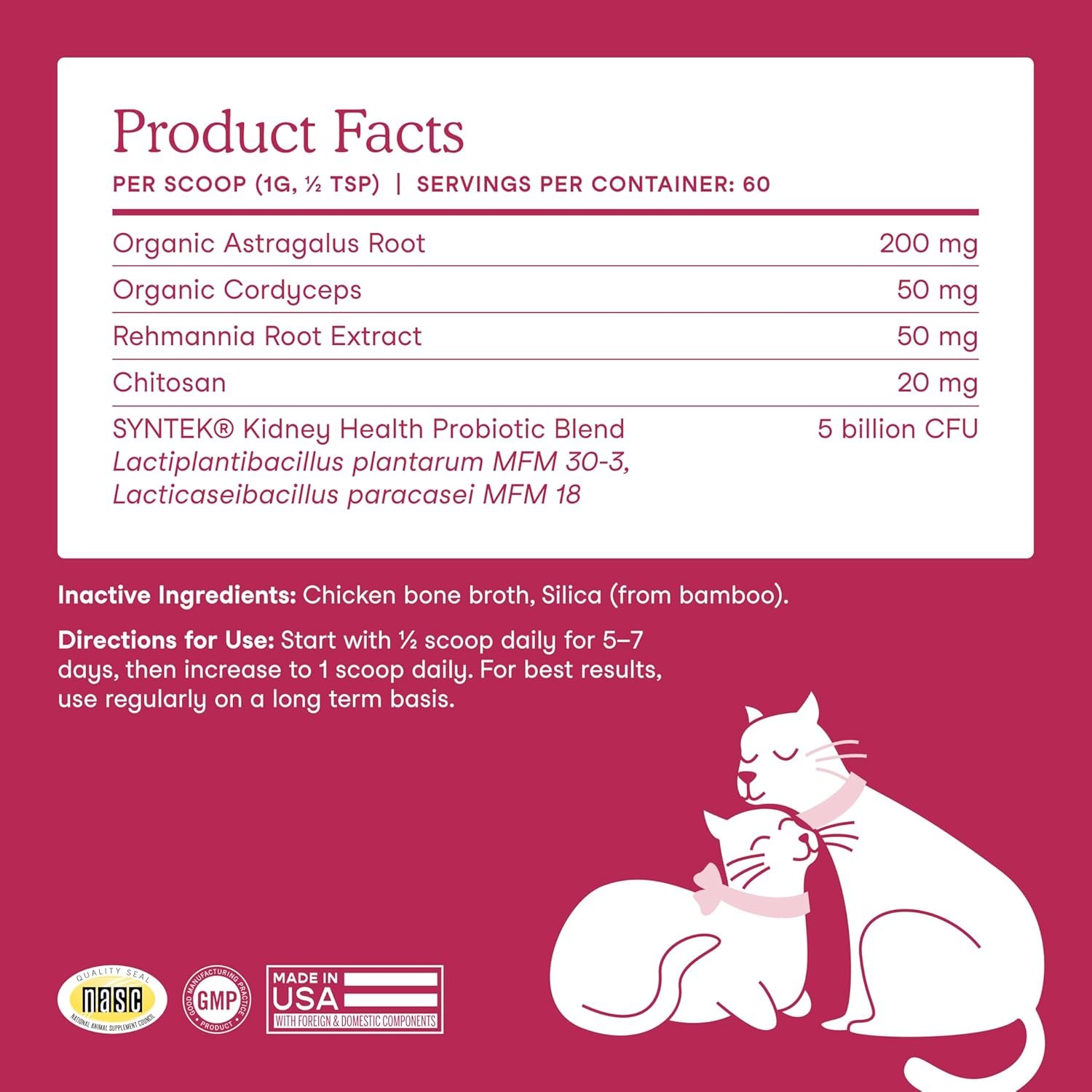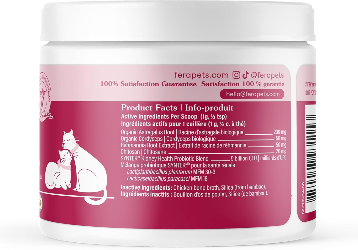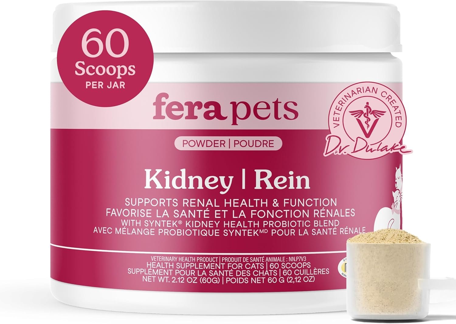 Total kidney support: Fera’s cat kidney support supplement is made from a natural formula and proprietary blend of probiotics for cats that supports healthy kidney filtration and blood pressure regulation to enhance kidney health and function