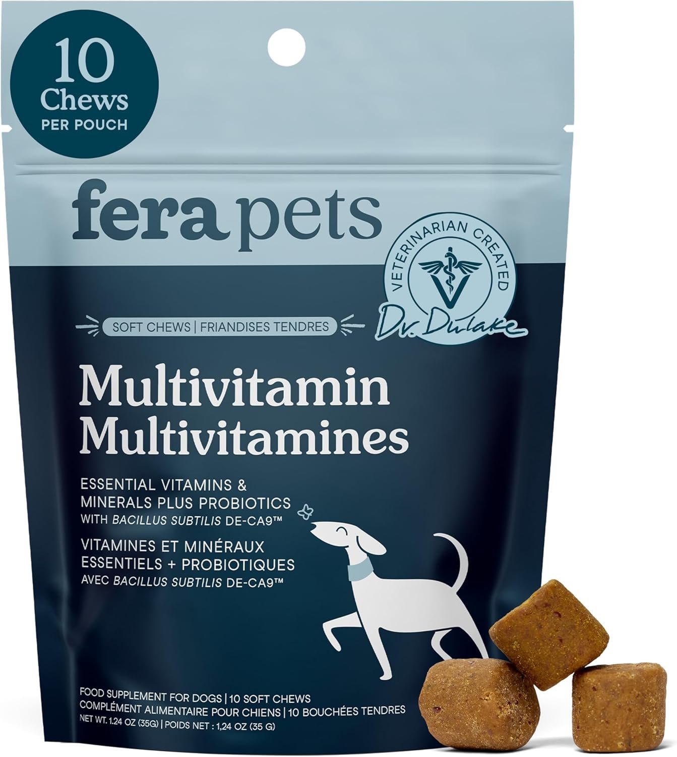 Fera Pets Dog Multivitamin Chews with Glucosamine and Probiotics – Essential Dog Vitamins & Minerals – Promotes Healthy Digestion & Joints – Boosts Skin & Coat Health with Omega-3s – 10 Soft Chews