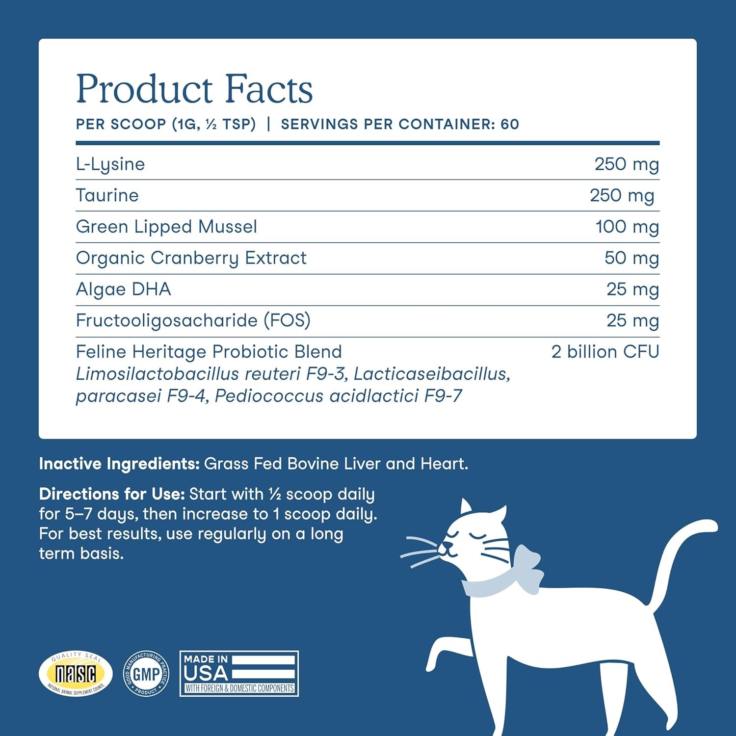 High quality ingredients: Address common wellness concerns with our unique blend of Lysine for cats, Taurine, Green Lipped Mussel, cat probiotics, and Algal DHA that promotes joint support along with heart and gut health