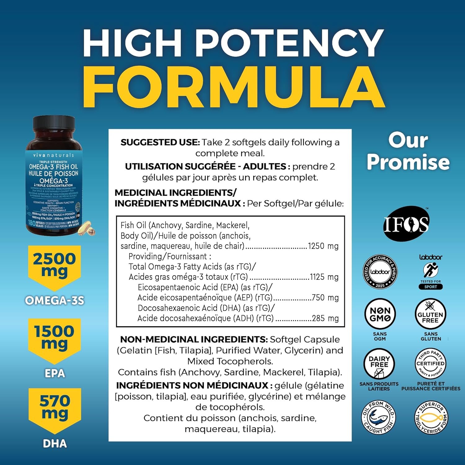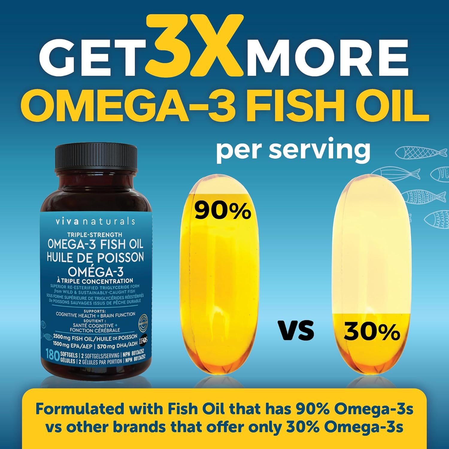 More Omega-3s In Every Serving – Looking for a high potency fish oil supplement? Our triple strength omega 3 fish oil delivers 3X more omega3s than some other brands—1,250 mg fish oil with 750 mg EPA and 285 mg DHA per softgel.