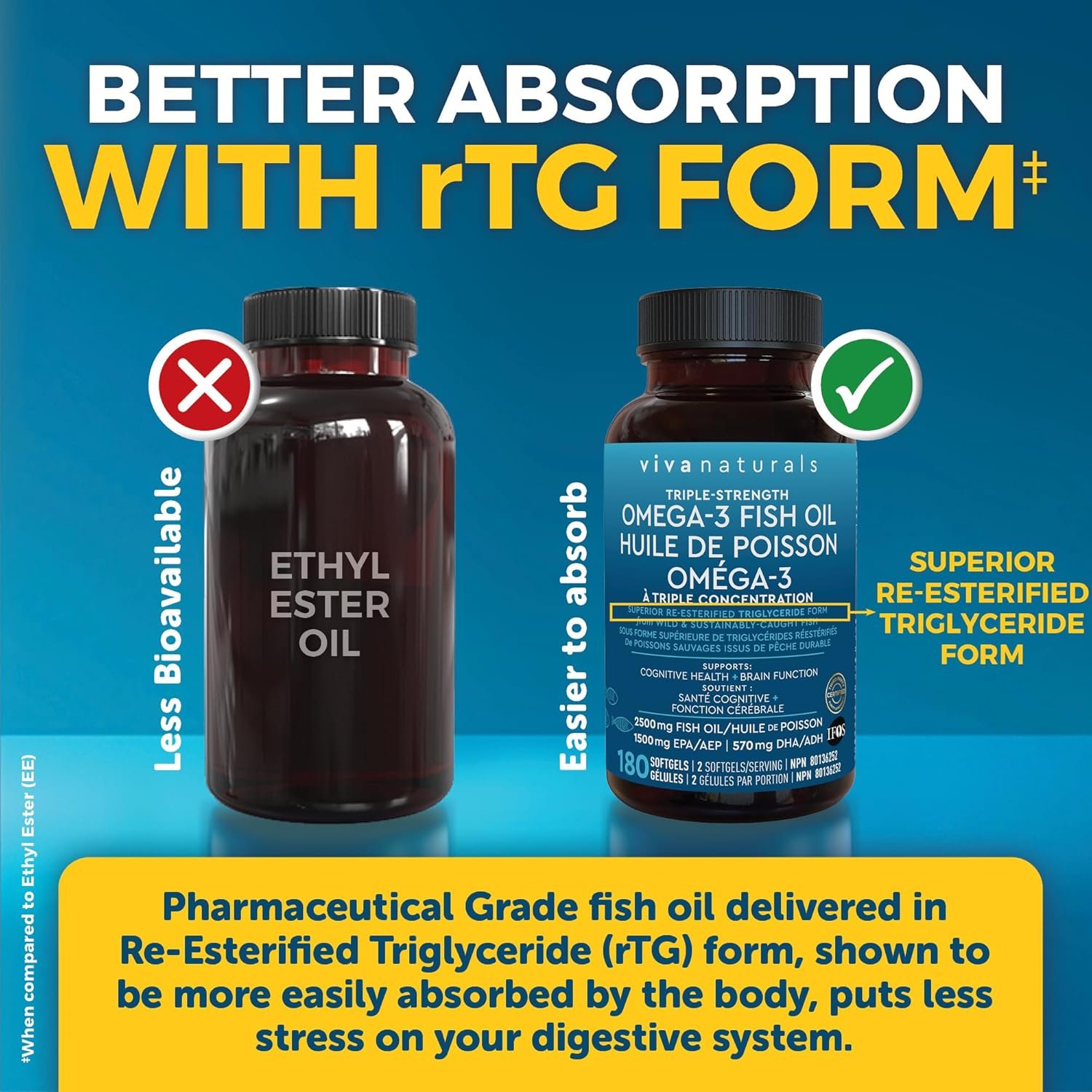 Absorbs Better Than Standard Fish Oil – Not all fish oils absorb the same. Our high potency omega-3 fish oil uses re-esterified triglyceride (rTG) form, shown to be more easily absorbed, so you get more EPA and DHA out of every serving.