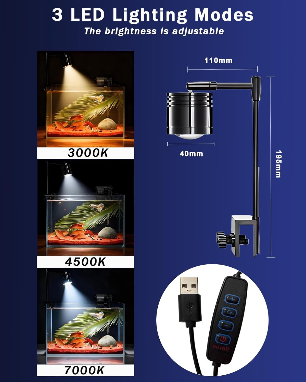 🐟Versatile LED Clip-On Light: The tank comes with a bright enough LED clip-on light. You can adjust the brightness and switch between three color temperatures: 3000K warm light (highlights warm-colored fish scales), 4500K natural light (shows the tank as it looks in real life), and 7000K cool light (clearly shows tank decor details). This lets you enjoy the beauty of your underwater world day and night. The light head is made of aluminum alloy, which cools down well. It also has a lens that adjusts light refraction to focus most of the light into the tank