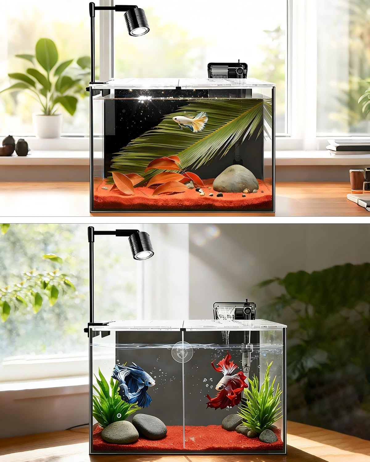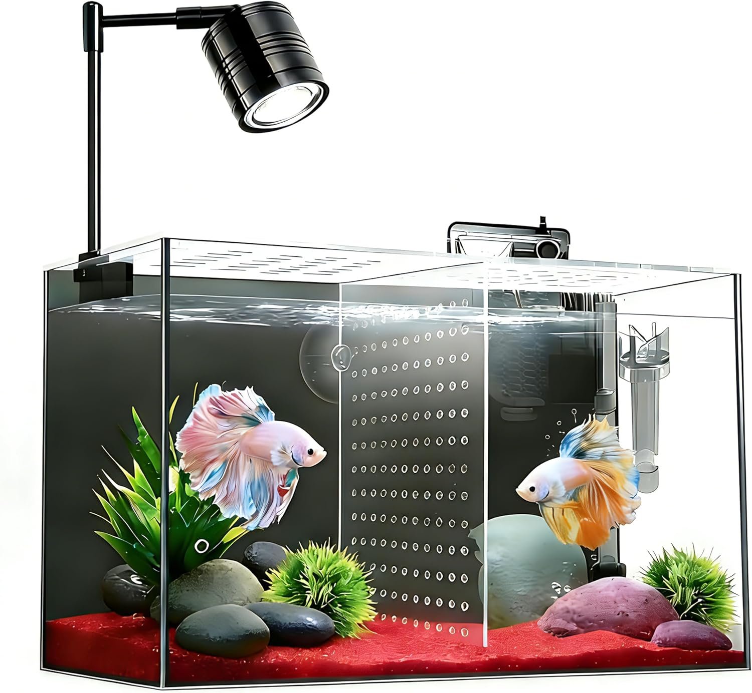 🐠The Perfect Aquarium Betta Tank: A 3-gallon nano glass aquarium that’s an absolute gem for aquarium enthusiasts! This rectangular beauty is tailor-made for Betta fish, guppies, angelfish, and other small, captivating aquatic companions. Equipped with LED lights, a hanging filter, and lids, we’ve even thrown in specialized dividers and shields—perfect for hosting two Betta fish, letting them swim with passion and rest in style