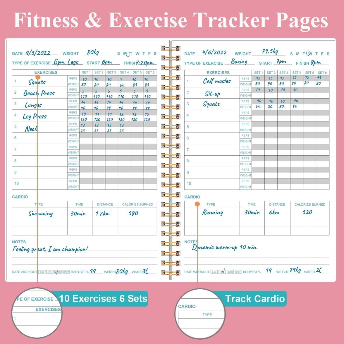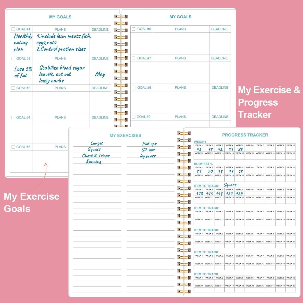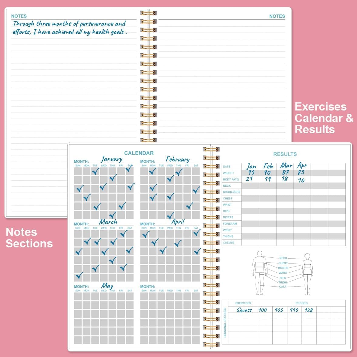 UNIQUE DESIGN – This easy and compact workout journal/planner has plenty of space for personal records. Such as contains person information page, my goals&plans, my exercises, progress tracker, calendar, results, routine workouts, exercise tracking pages and notes pages for note-taking, lists, goals etc, which help you manage your workout log efficiently and achieve your goals perfectly.