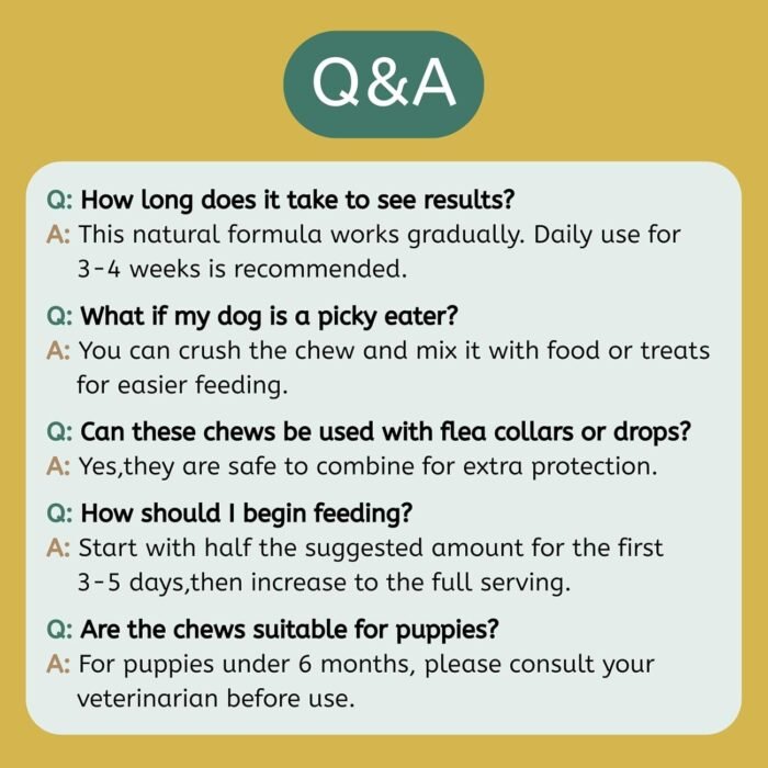Gentle Yet Effective: Formulated with nourishing ingredients like coconut oil, flaxseed, and brewer’s yeast, our chews are free from harsh chemicals and artificial additives. Safe for puppies and older dogs alike, they offer a gentle, natural solution to flea prevention without compromising on effectiveness.