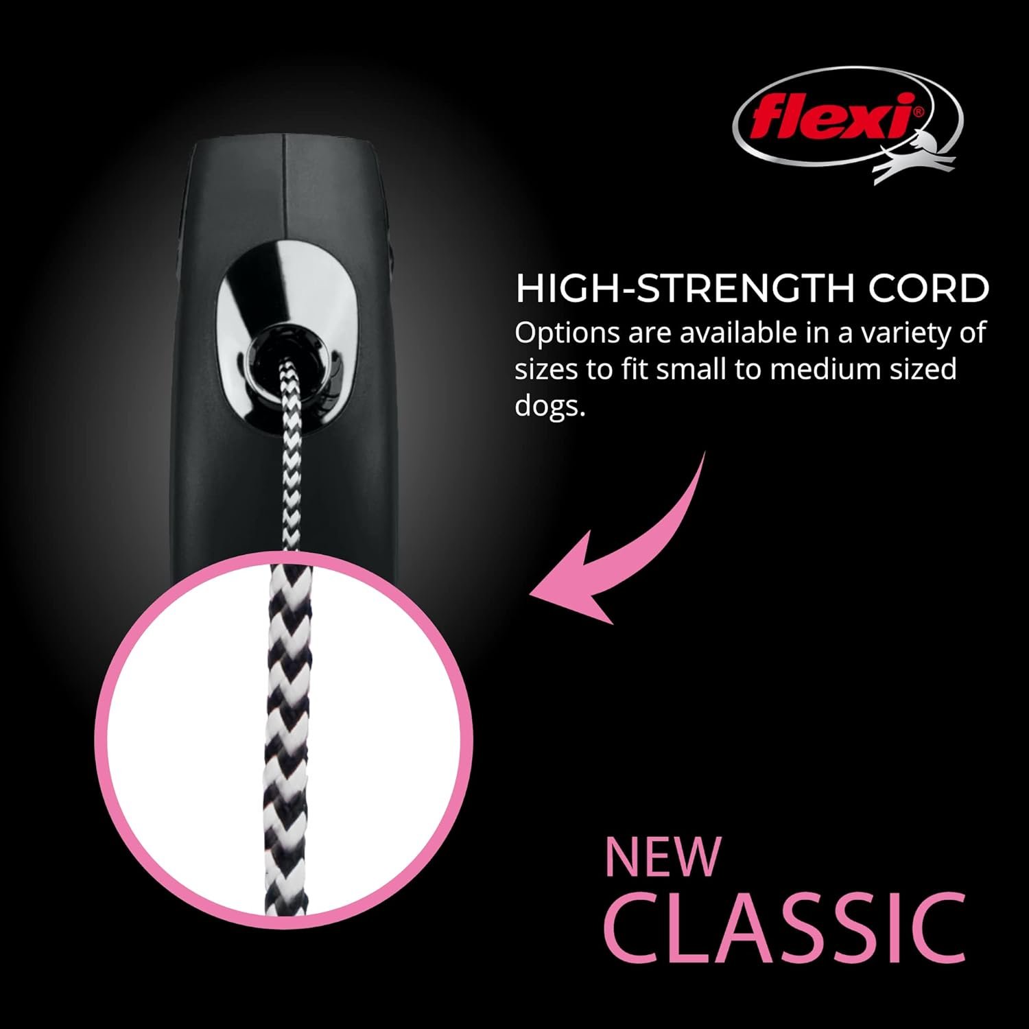 FLEXI New Classic Cord Retractable Dog Leash for Medium Dogs up to 44 lbs. – 16 ft., Black | Tangle-Free Pet Walking Leash with One-Handed Brake, Pause, Lock|German Quality Product