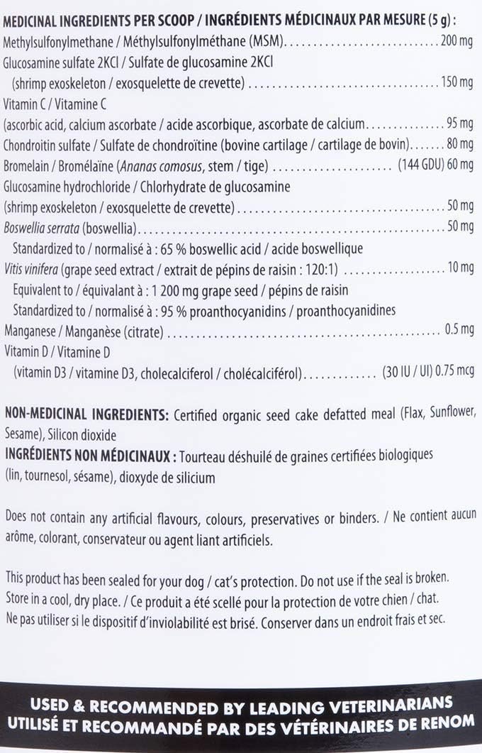 BioJOINT® is a holistic, nutritional supplement for dogs & cats, designed to help activate the chondrocytes (worker cells of the cartilage), and support their effective use of glucosamine in the rebuilding of collagen. Without this activation, glucosamine serves as an anti-inflammatory agent without effectively contributing to tissue regeneration. Supplying 200 mg of MSM, 200 mg of glucosamine complex (sulfate, hydrochloride) and 80 mg of chondroitin per 5 g scoop (used for each 20 lb of animal’s body weight), GMO-Free BioJOINT® contains a blend of powerful antioxidants, vitamins and herbs that facilitate a healthy inflammatory response and support healthy joint function. These daily food supplements are formulated for dog and cat immune support and to encourage the most effective delivery of nutrients, maintain nutrient density, feed efficiency and help maintain general health at every stage of your pet’s life. They are the ideal cat / dog food supplement powder for your senior pet. The foundation of our cat & dog supplement powder formula is prebiotic microfiber – a lignan-rich blend of organic defatted flax, sunflower and sesame seed organic fibre, which supports healthy immune and metabolic function. For optimal results, using BioJOINT® in combination with BioFATS® provides a powerful synergistic support to your pet’s immune system, regulation of inflammatory response as well as joint and connective tissue support. BiologicVET® has committed to Health Canada’s Veterinary Health Products (VHP) program, in accordance with GMP requirements. VHP ensures that only approved and safe ingredients are used in the products. BiologicVET® Supplements are a carefully designed holistic system with BioFIBRE, formulated to work synergistically to maximize the nutritional content of your pet’s diet. Formulated for your dog or cat’s unique biological makeup. A perfect senior cat joint supplement choice. Potency and freshness guaranteed. Cats and dogs love it, they’ll lick their bowl clean. Does Not contain artificial: flavours, colours, preservatives or binders.