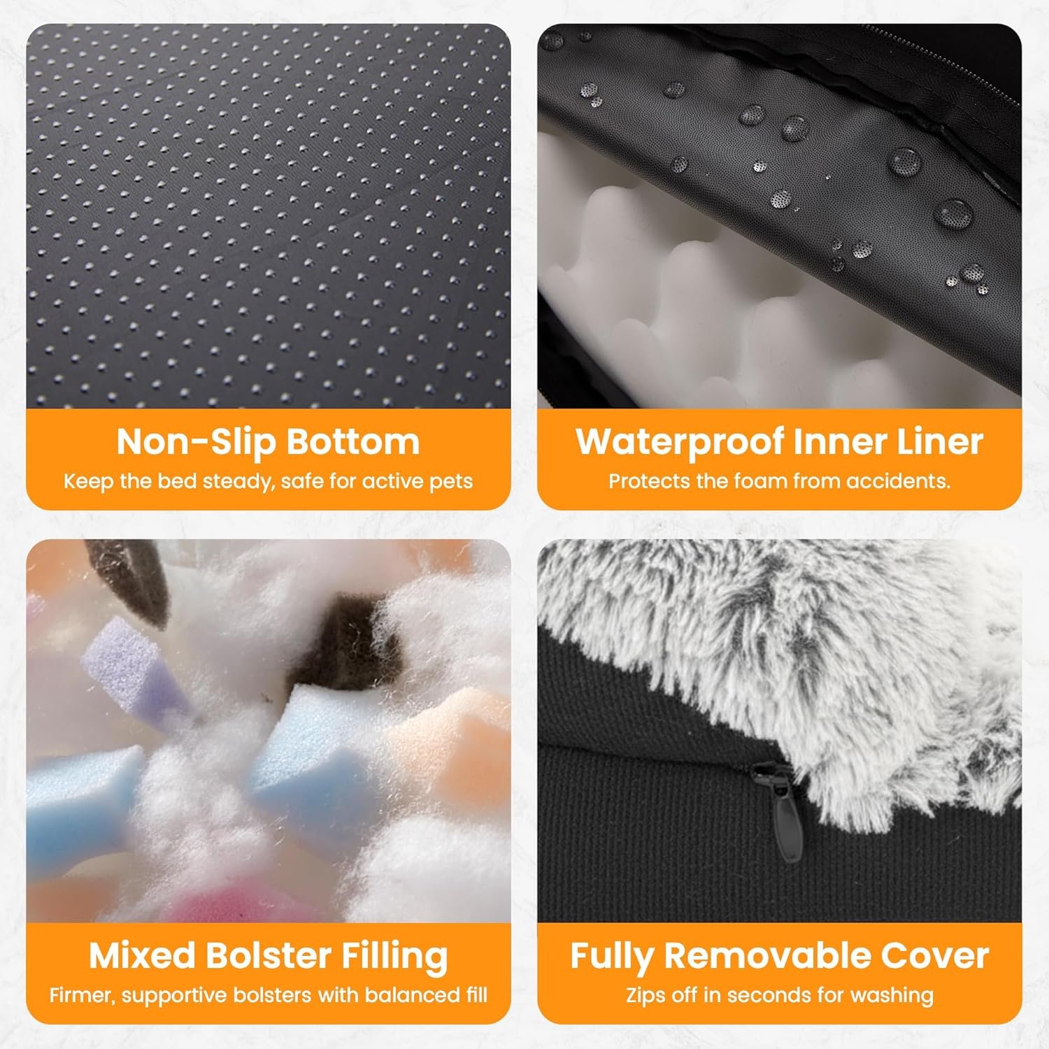 Easy Care & Practical Details – Real life = shedding, drool, and spills. The removable, machine-washable cover plus waterproof inner liner protect the orthopedic foam; the non-slip bottom keeps the bed in place on wood or tile. Ideal for multi-dog homes and daily use.
